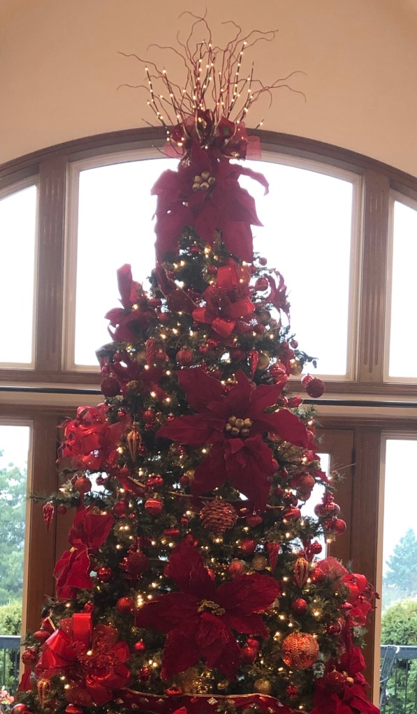Are you wanting to build your floral inventory? Start by trying a new theme this Christmas. Maybe you have never done a dramatic scale. This year, use a large impact flower (10-20″). Remember, these should be higher quality floral stems. Depending on the size of your tree, you don’t need as many as you might think. Using odd numbers, stagger them around the tree. Give them even bigger impact with a bow behind each one.
