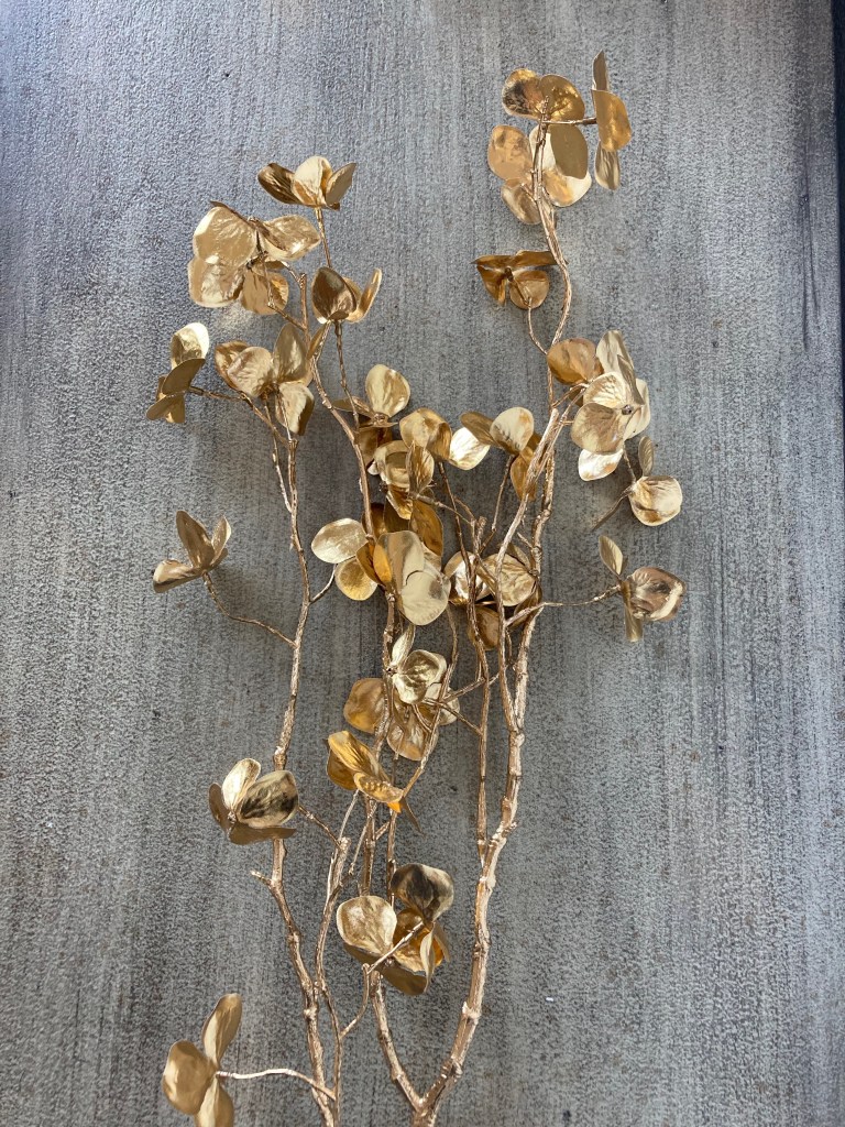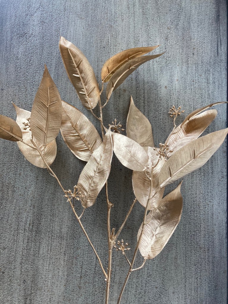 When buying feature florals, I remember to have various sizes in my inventory. This will allow for interesting combinations or different placement and use. For example, a 30″ poinsettia will be stunning on the tree, but too large for a tablescape. To bring interest and texture to my decorating, I buy varied styles and sizes of basics – round and elongated, small, medium and large. For example, here are some of my gold leaves:
