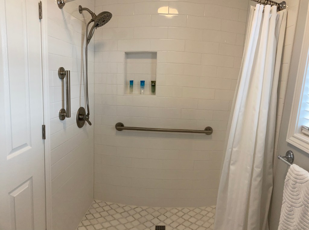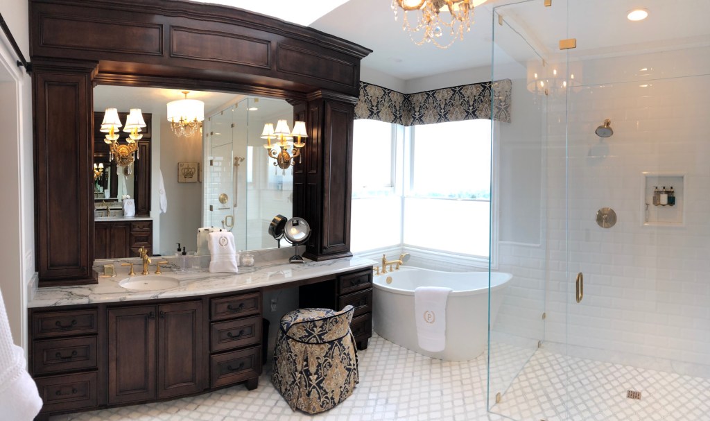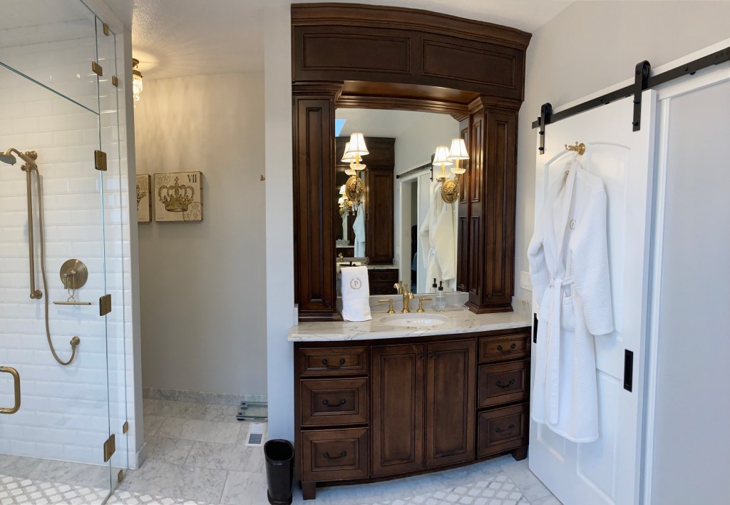 We wanted a traditional, luxurious, and timeless look in the bathroom. To achieve that, we mixed metal finishes – Manzoni bronze cabinet hardware, Newport Brass plumbing fixtures in Satin Bronze, Crystorama crystal chandelier lighting in Aged Brass. We wanted the custom vanity cabinets to have a furniture feel, so they are stained and glazed similar to the bedroom furniture. The rich warm color keeps the room from feeling sterile or modern. The towers add additional and useful storage, while hiding electrical outlets. The long vanity sink cabinet was designed to be removable to allow for wheel chair access in future, if necessary. The walls are Metro grey with white in the closets. The slab countertops are Infinity quartzite (also known as Lamberti Bianco), the heated floor field tile is Vestal White Arabesque Mosaic surrounded by Carrera marble 12×24 tiles. The shower walls are beveled subway tiles. We opted for Starphire glass for the curbless floor to ceiling frameless shower to eliminate the green cast: