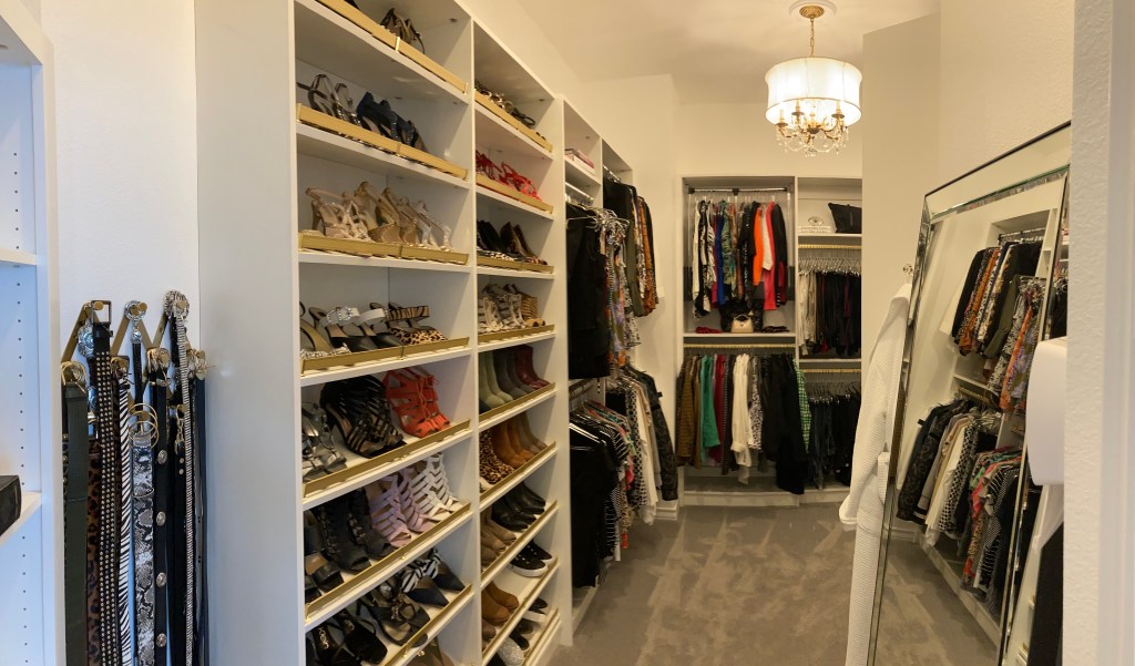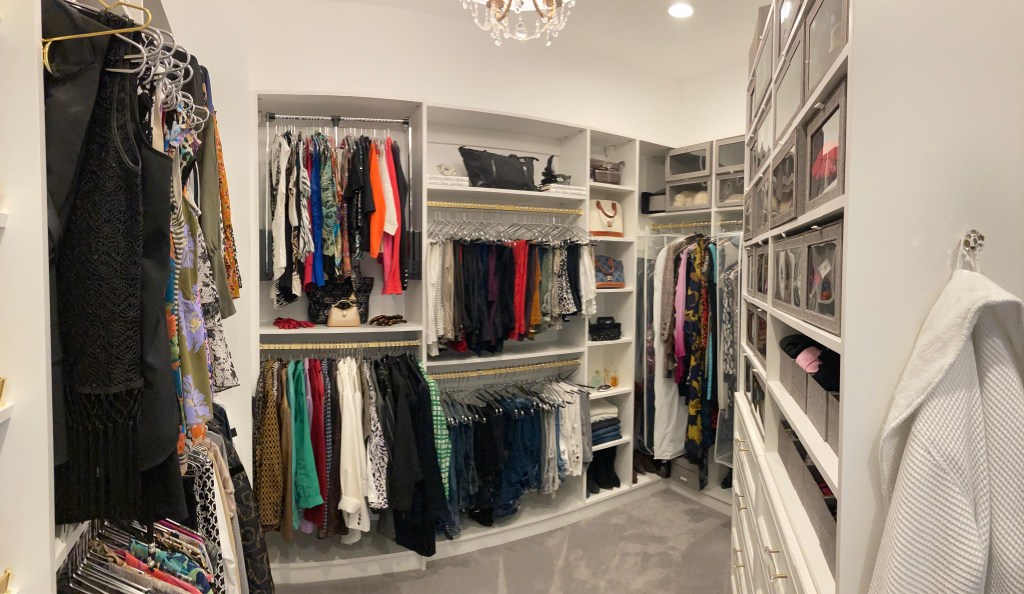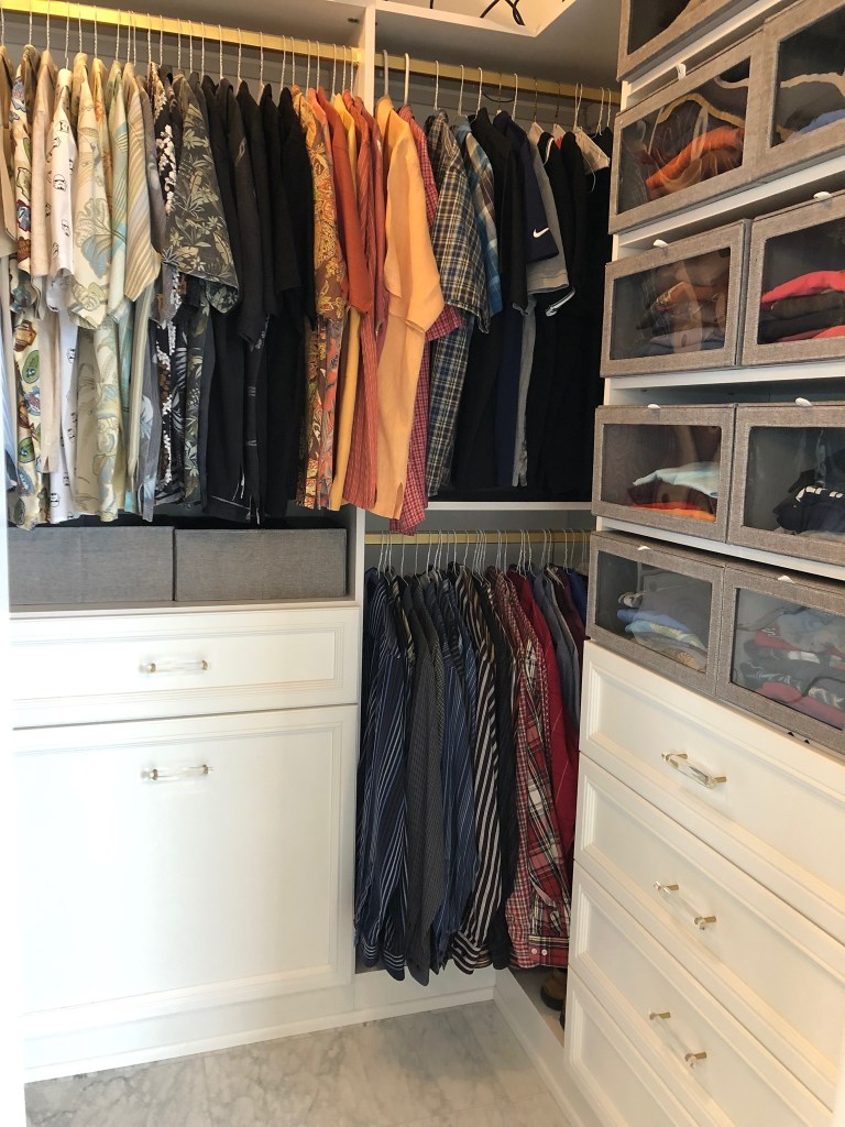 “Her” closet is hidden behind a Bookshelf secret door. The California Closet features tilted shoe shelves, gold shoe rails, gold valet rod, drop down pole arms, retractable drawer ironing board, and base trim. The closet drawer pulls are Restoration Hardware Camdon crystal hardware. The grey linen Cambridge boxes are from the Container Store: