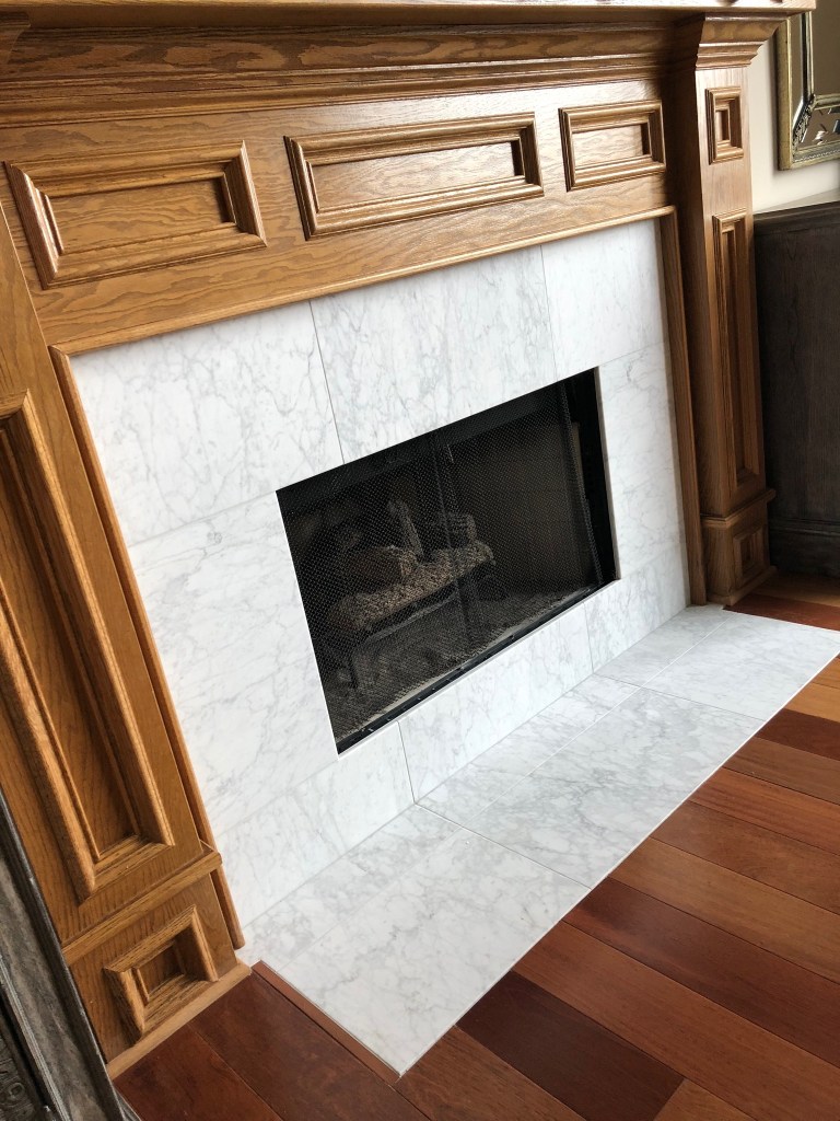 We replaced the dining room fireplace pink granite surround (yes, pink) with 12×24 Carrera marble tile as used in the Master bathroom.