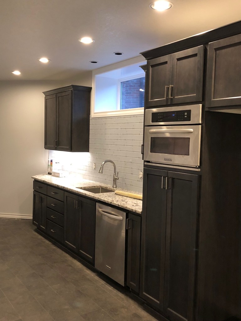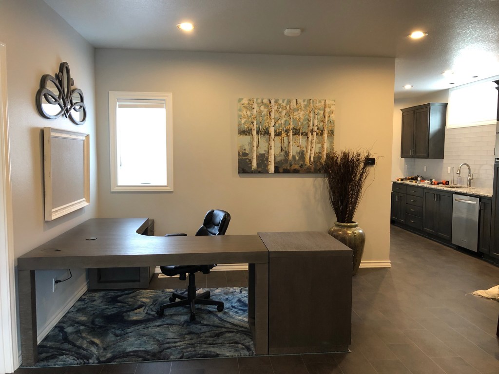 The lower level of the addition, used for office space, is a 2 bedroom in-law suite with full bath, kitchenette and additional storage area. The grey cabinets and granite countertop are the same as the Theater Foyer: