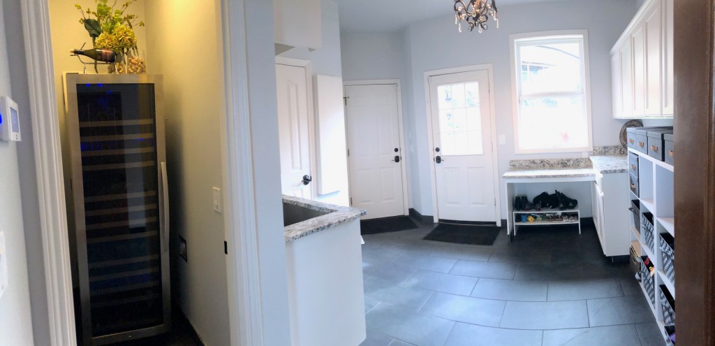 Soon after, we replaced the laundry room vinyl floor with Bedrosian Simply Modern 12×24 Black tile to match the addition hallway and Theater Foyer. Since we added the laundry to the Master bath closet, we left the hook ups here, but removed the washer/dryer. The Anaglypta was painted Metro grey to match the walls. The cabinets, doors and trim were painted white. We also removed the toilet and door to use the space as a wine closet: