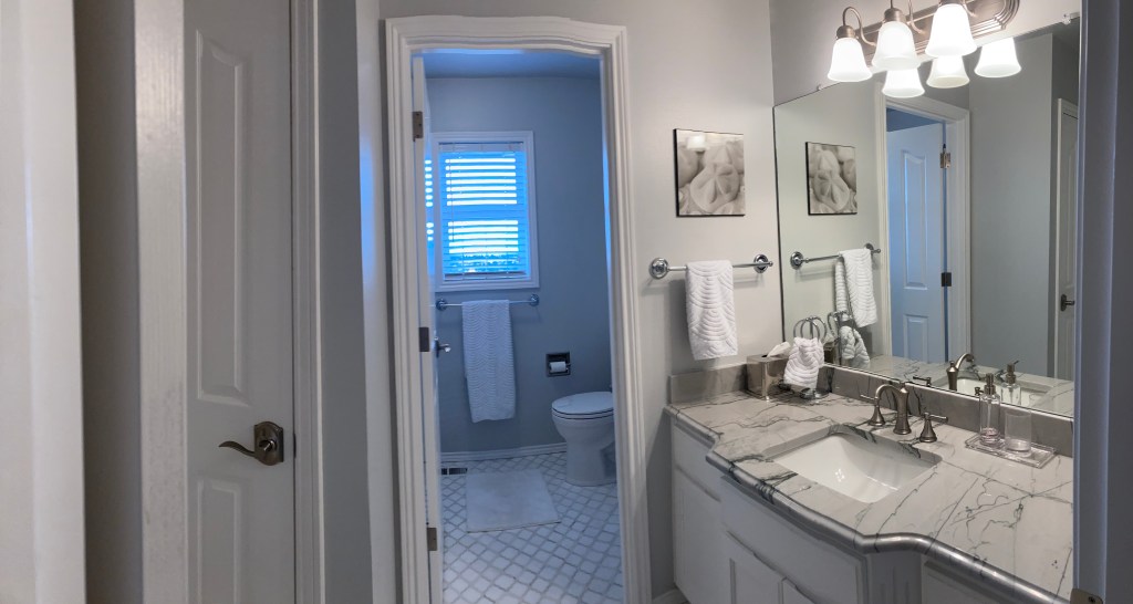 The next project was to replace the kitchen island granite with infinity quartzite. Quartzite is the hardest natural stone and perfect for a kitchen application. The color and veining of Infinity nicely replicates Carrera marble, which would be the typical stone of the Tudor period. It made sense to replace the cooktop & downdraft, add a second dishwasher (at the bar area), and second oven at the same time, finishing the Jennair appliances update. Knowing we would have a remnant from the slab, we decided to update one of the upstairs bathrooms. We pulled the drop-in fiberglass tub/shower and replaced it with a custom tile shower. We used similar floor and shower wall materials as in the Master bathroom. We also purchased new light fixtures, faucets, and under mount sink. We added a door to make it ensuite to the nearby bedroom. All the woodwork was painted white and the walls Metro Grey.