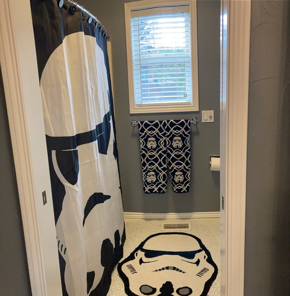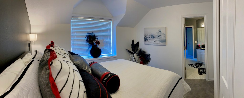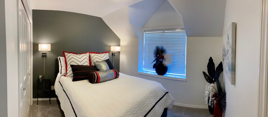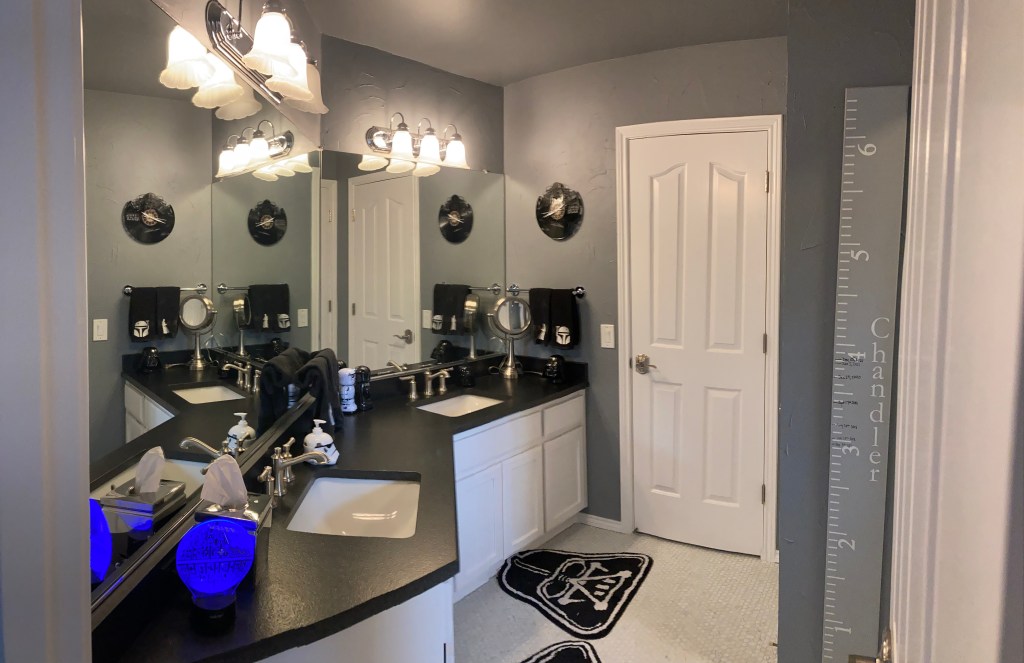 The second bedroom connects to the Star Wars bathroom (Jack and Jill set up with bathroom between two bedrooms). We wanted this room to be a modern guest room with a subtle nod to coordinate with the ensuite Dark Side bathroom. The main colors of white and gray feel fresh and current. The black and touch of red move the eye around the room. The bed wall was painted Zen Retreat and the other walls, ceiling, and trim were painted white. The black Cayman headboard and platform bed give a solid backdrop to the Eastern Accent Percival pillows. The wall lamps continue the modern look and the white lampshades pop against the dark gray wall. Below are small black metal side tables. The canvas artwork from a distance looks like snowy mountains. However, a closer look reveals Star Wars ships and vehicles. Simple floral arrangements of white and black leaves fill the large white spaces and add drama in the window box and from black and red floor vases.