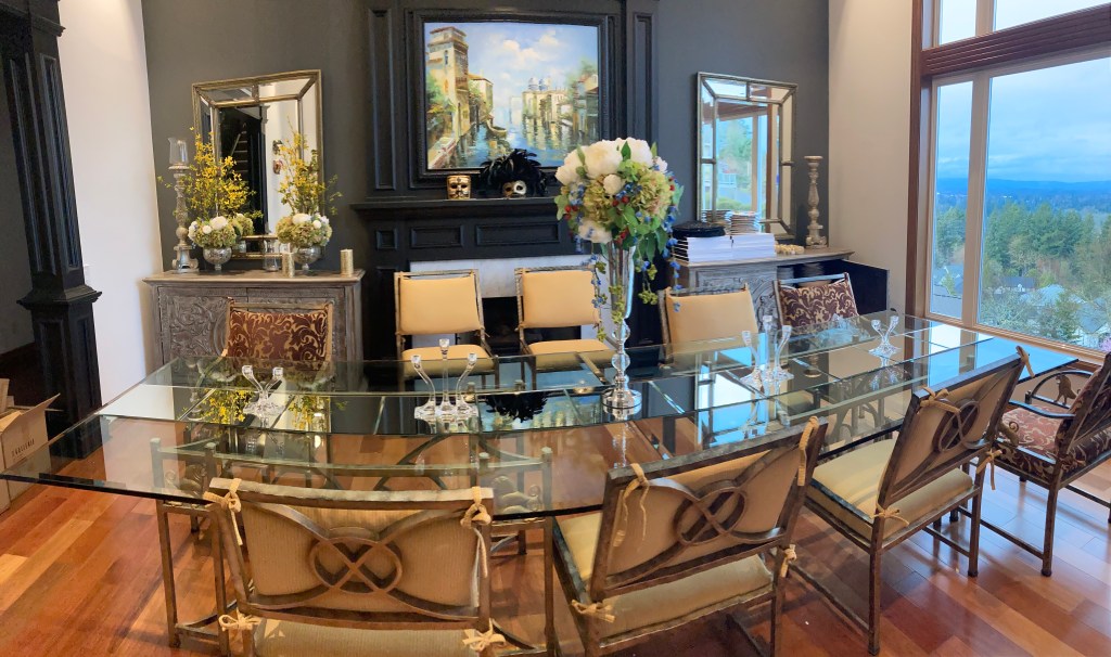 Elements from the Dining room decor are repeated in the Kitchen, Great room, and Living room.
