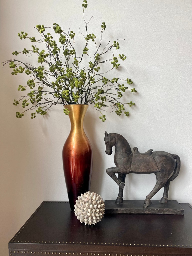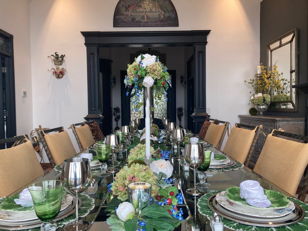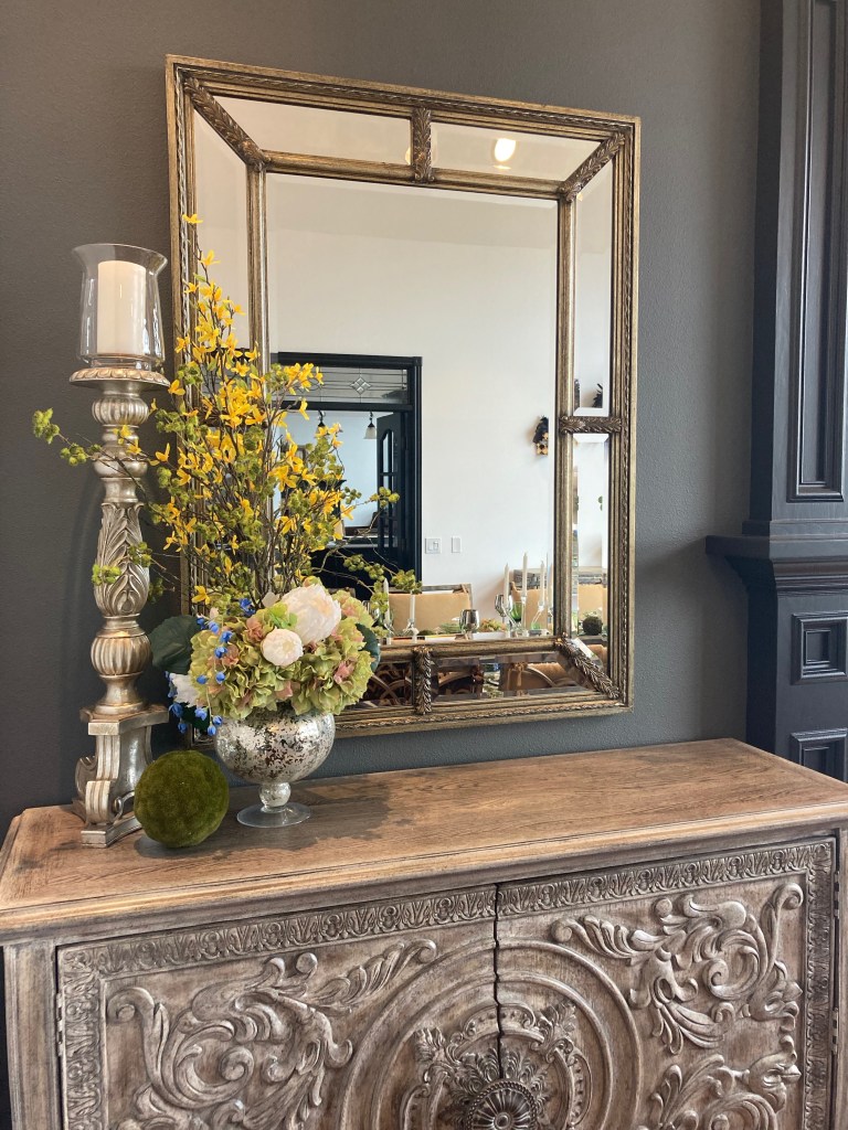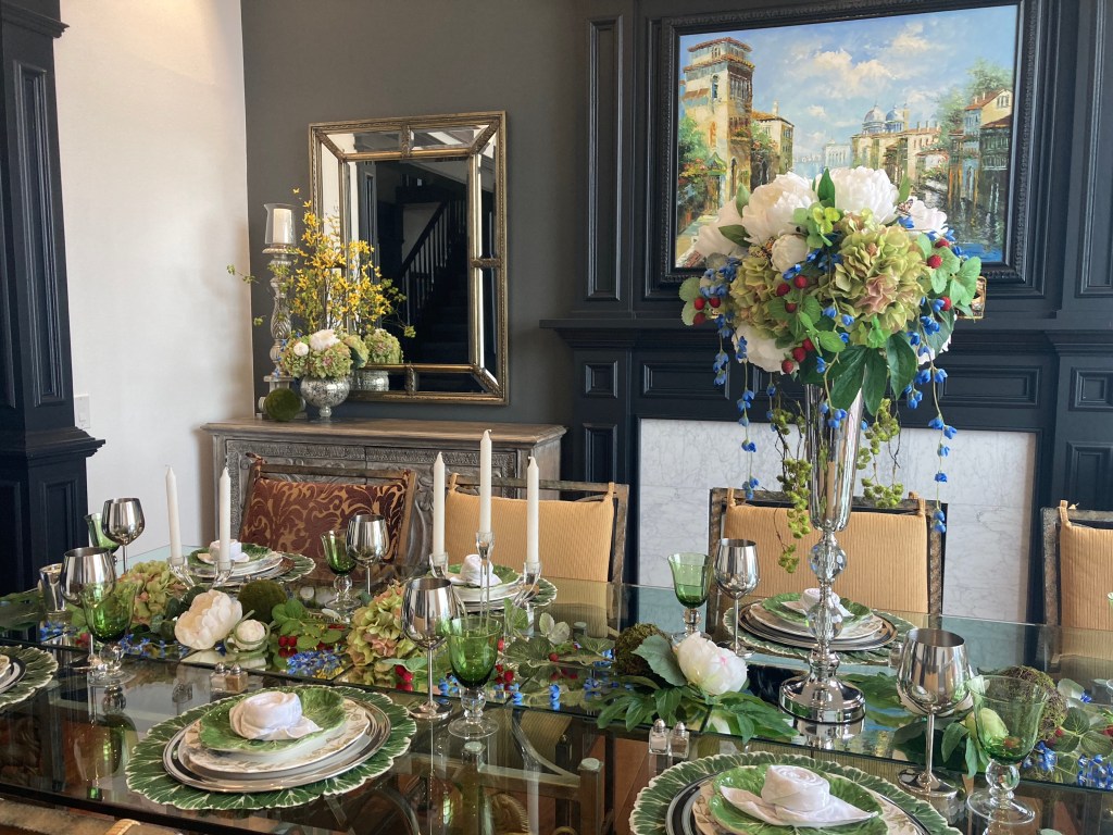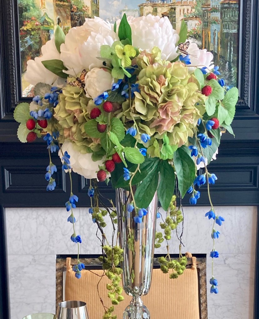 The arrangements for the two sideboards are similar to the table centerpiece. They are mercury glass footed lidded urns. (I previously used the large version for the centerpiece on the table, but it was broken a few years back.) I opt to keep these arrangements in storage to save time each year. Again, these are easy to assemble. Start by removing the lids and placing 3-4 hydrangea low around the edge of the urn. Add in a few white peonies atop the hydrangea, then use tall yellow forsythia branches at the center for height and volume. Place a few greenery leaves. Finish by adding a couple blue dangling florals and perhaps a butterfly.