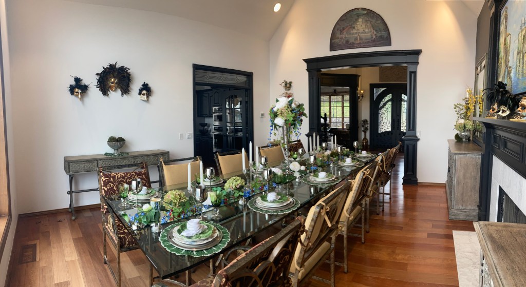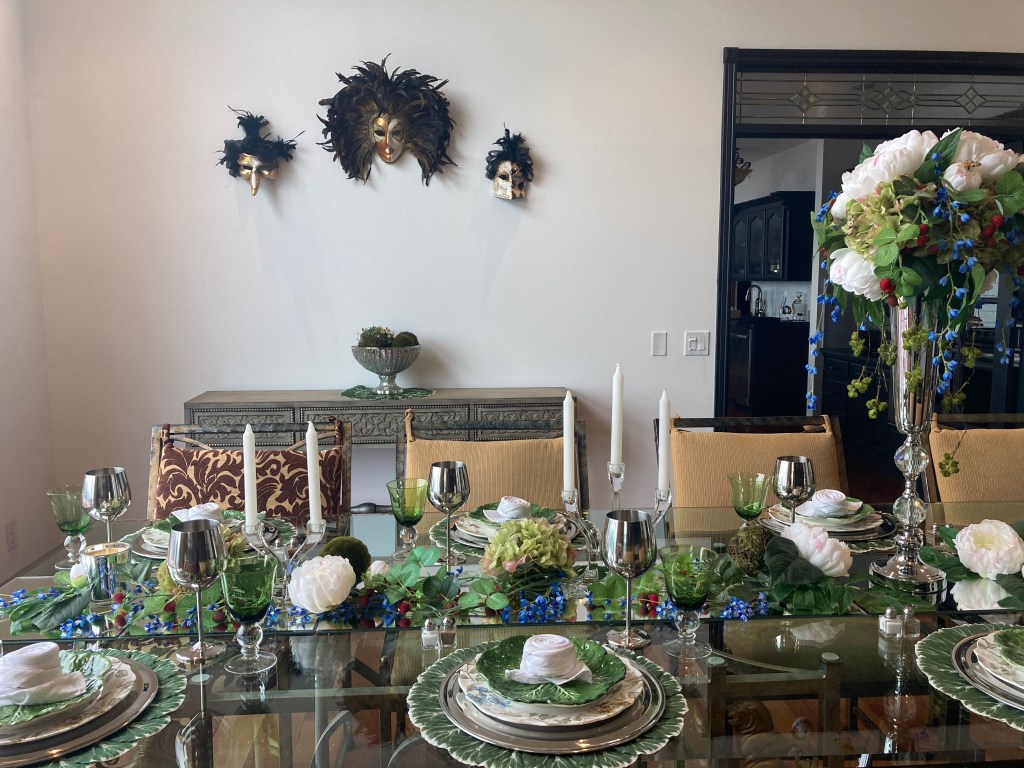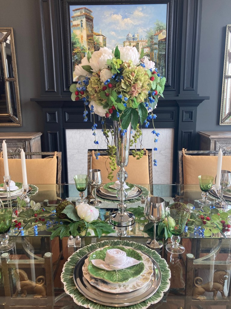To finish the center tablescape, I place the berry vines around the candlesticks. I curled the ends of the stems to make them more decorative. I placed the white peonies atop the curls, and also hydrangea to change it up from last year. I filled in around the flowers with various greenery leaves and then placed the blue floral vines throughout for a pop of color and more fullness. At each end of the mirror runner, I use silver mirrored glass candles and more florals for a low height finish. For a little more interest and to vary it from last year, I added faux moss orbs of various finish to the centerscape, as well as the mercury glass bowl on the side table.