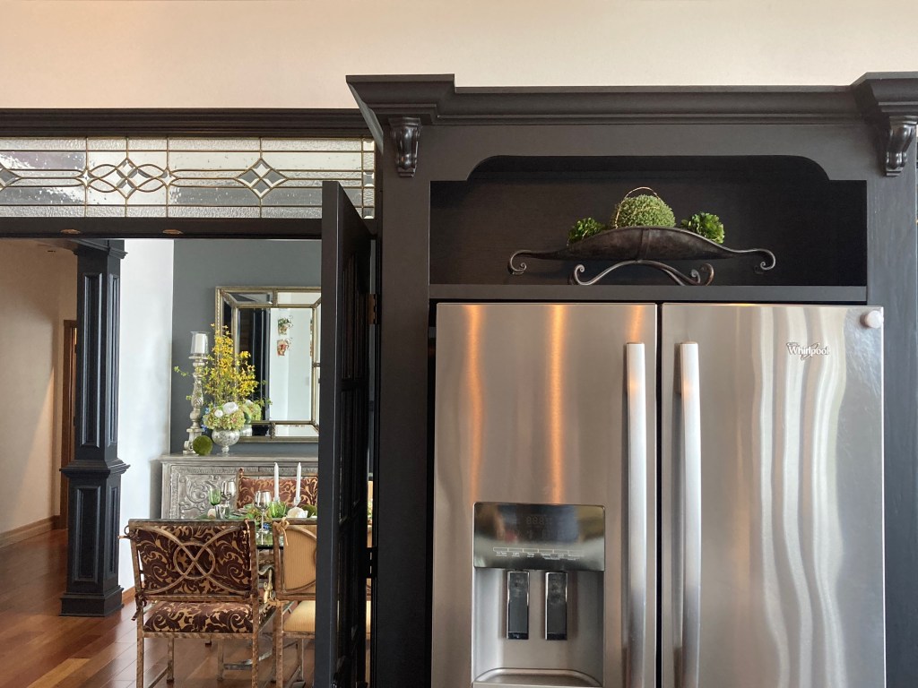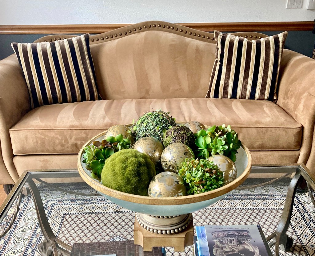 (Once everything else was cleaned up and properly put away, I added the faux moss orb as a finishing touch to the sideboards.)