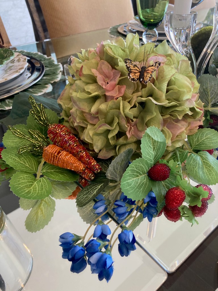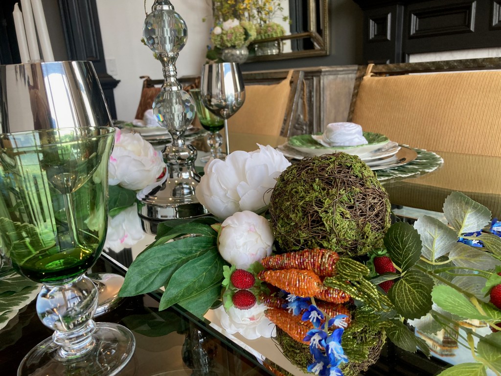 I found moss covered bunnies and added those in the Great room and dining room. I use the beaded carrot napkin rings (I have had these for years) to give additional color to the table centerscape and the side table arrangement, and to further highlight the bunny theme.