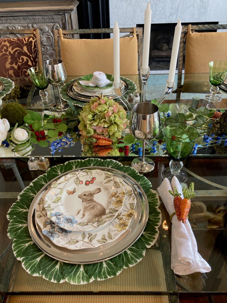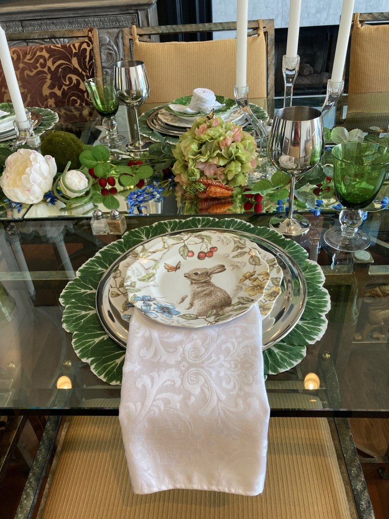 First, I swap out the green cabbage leaf salad plates for the Bunny salad plates which coordinate with the dinner plate.