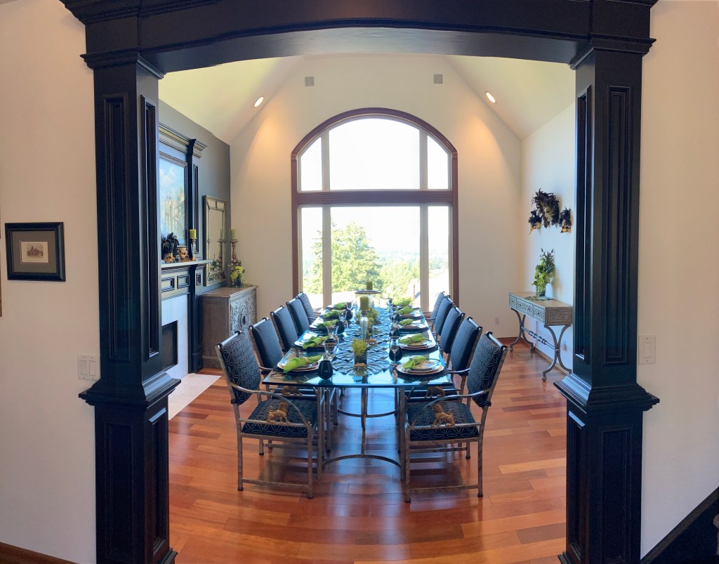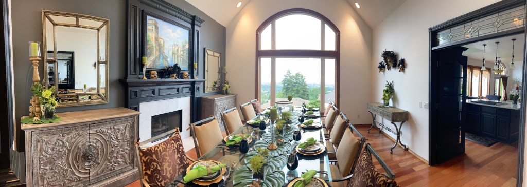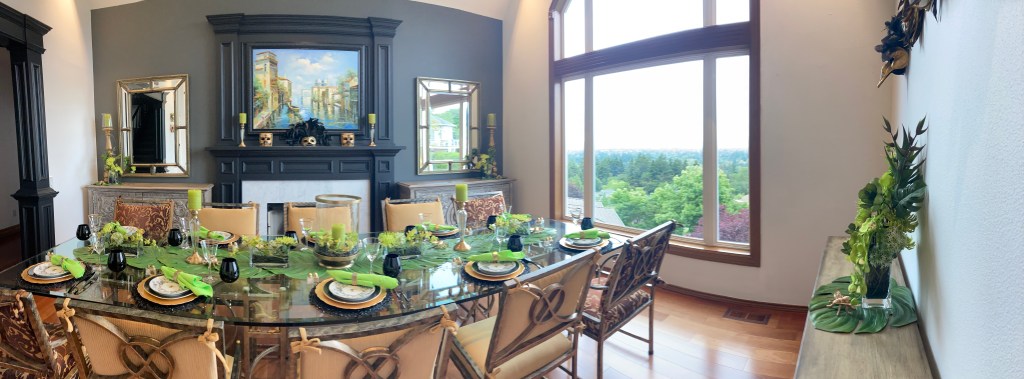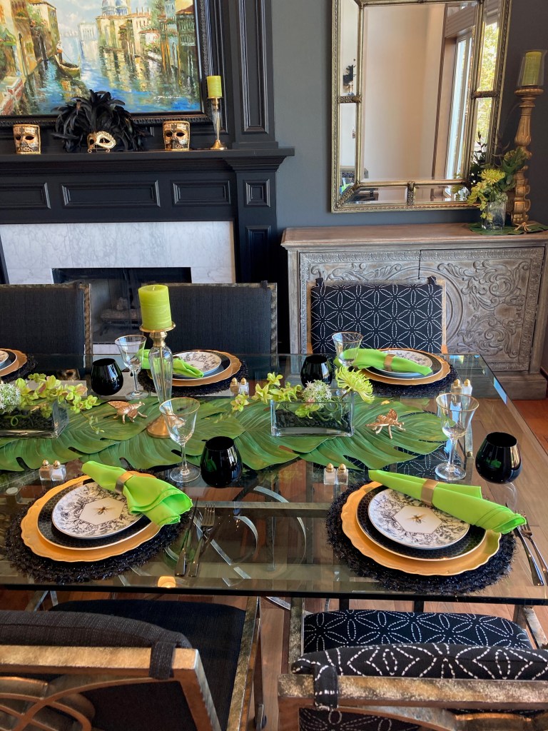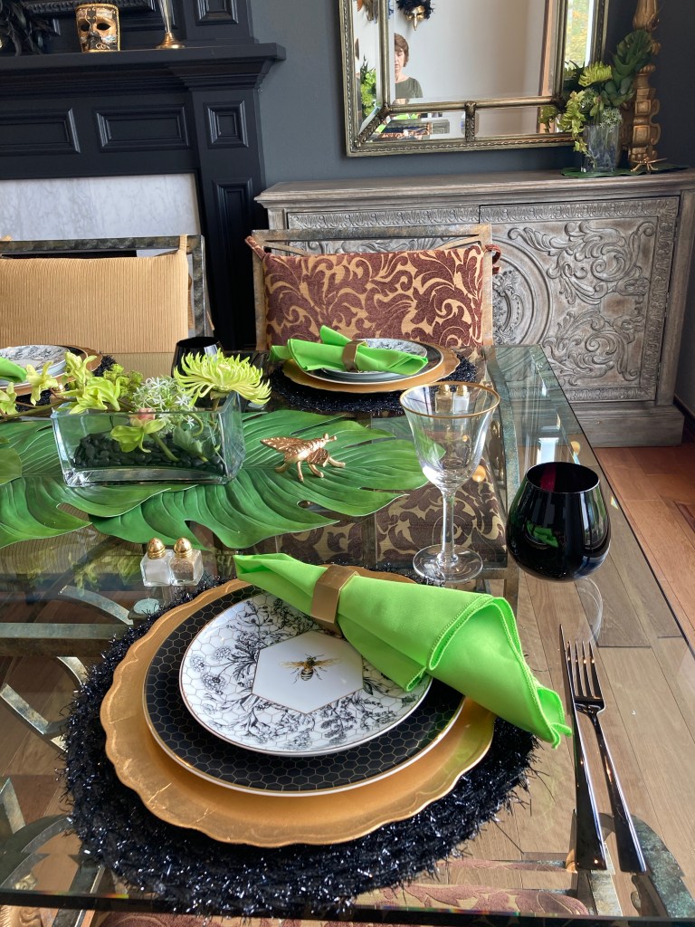 As I looked through my past decor looks, I realized my dining chair fabrics did not always work well with the themes. While I love the fabrics and they coordinate and repeat throughout the house, the arm chair fabric especially can distract or compete with the dining room decor or theme colors. After considering the Fasching Black & Gold decor, the Spring Black & White look, the Summer Black & Green Bee theme, I realized black chairs would really work well in the room.