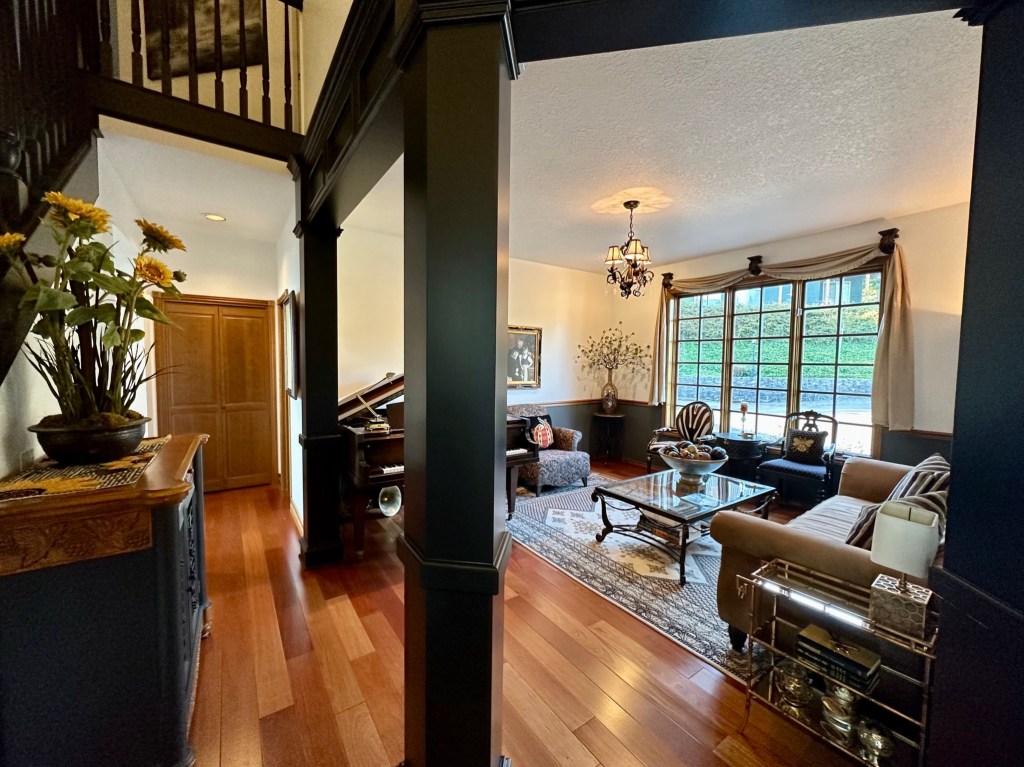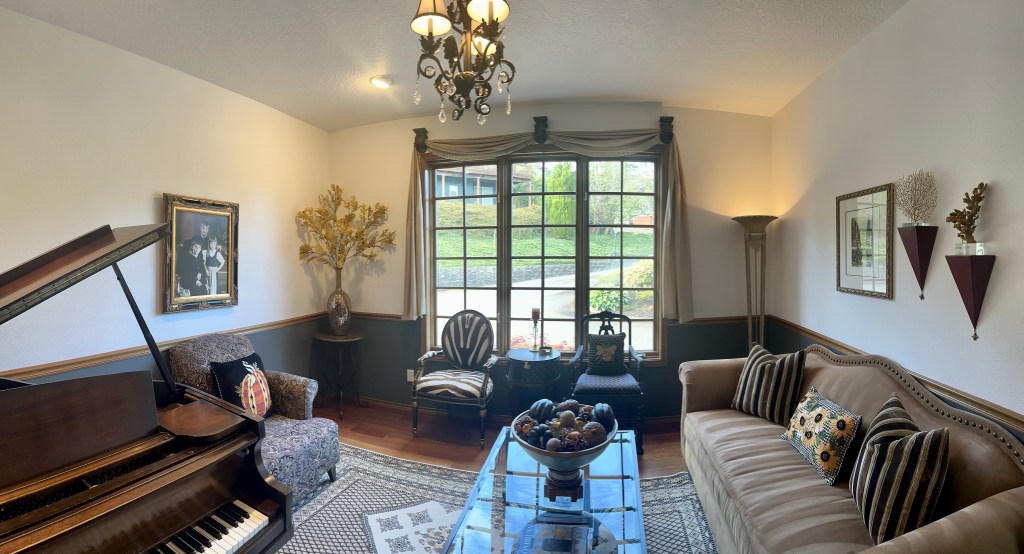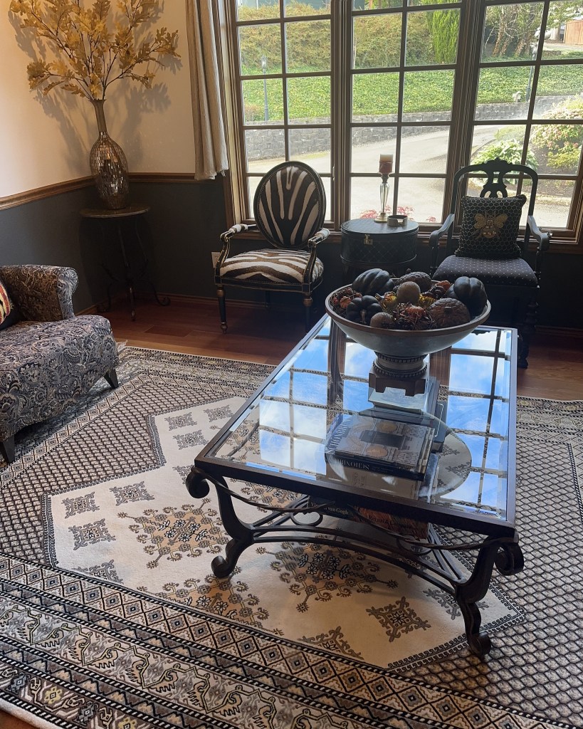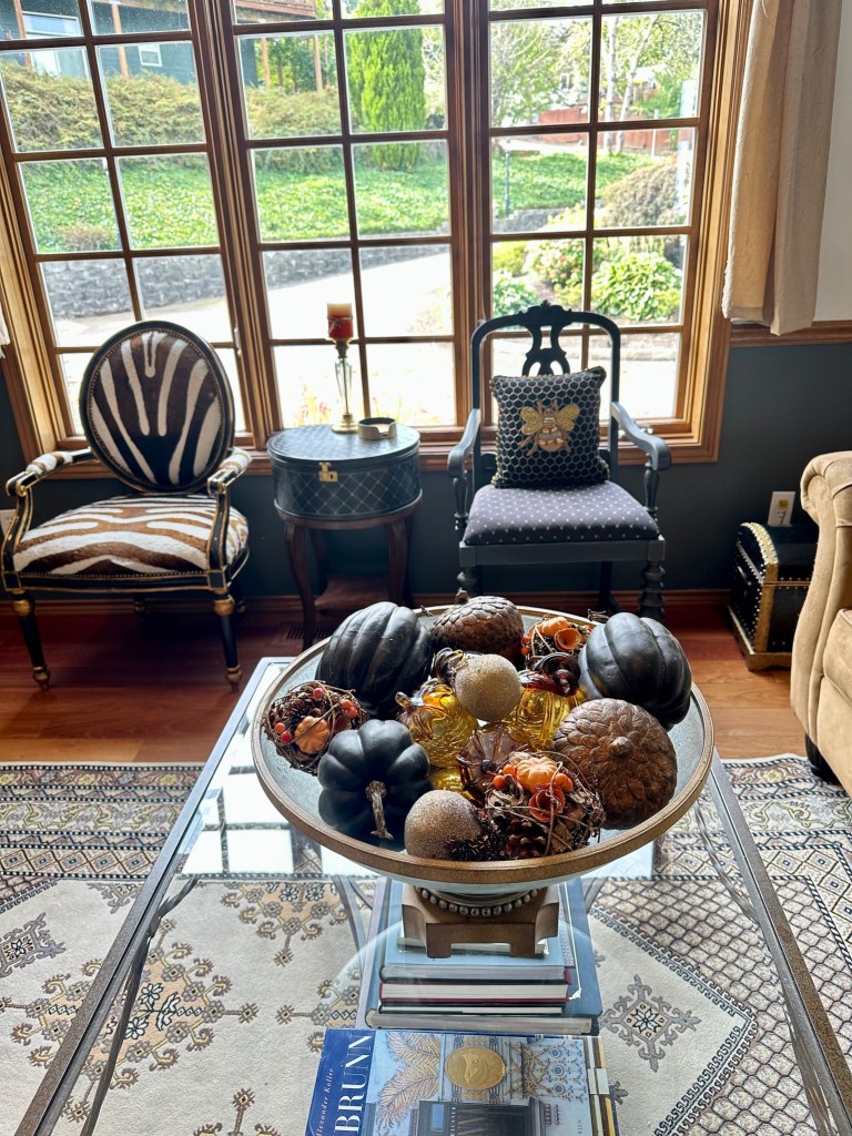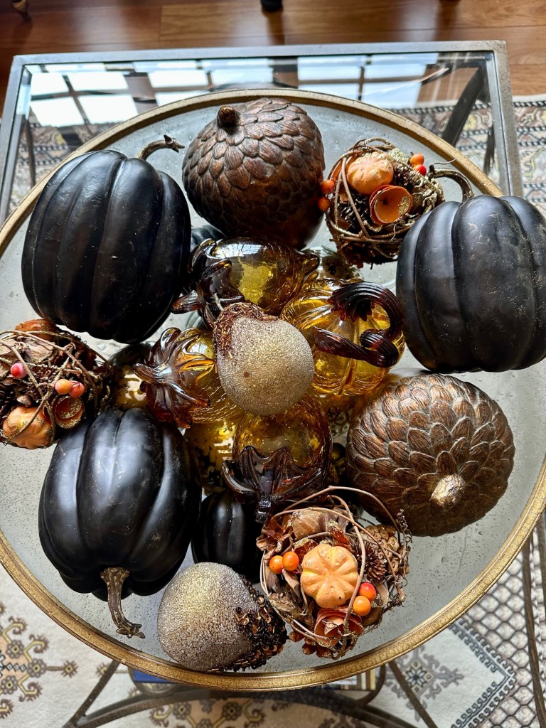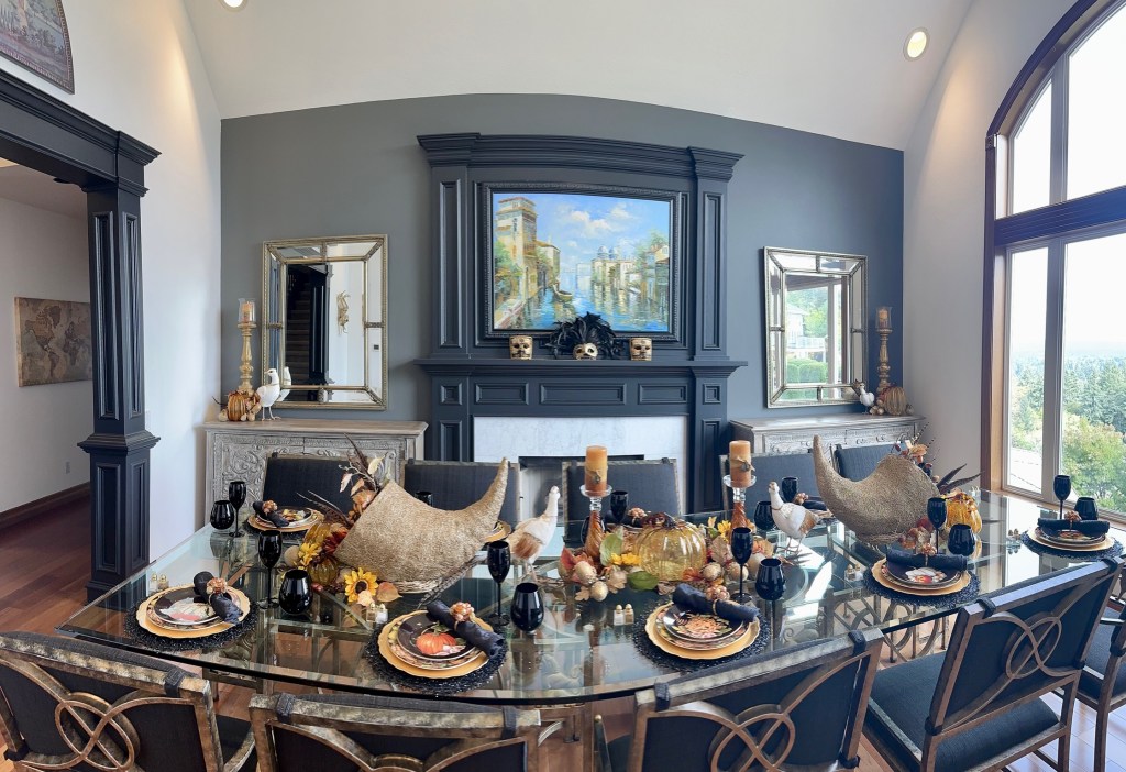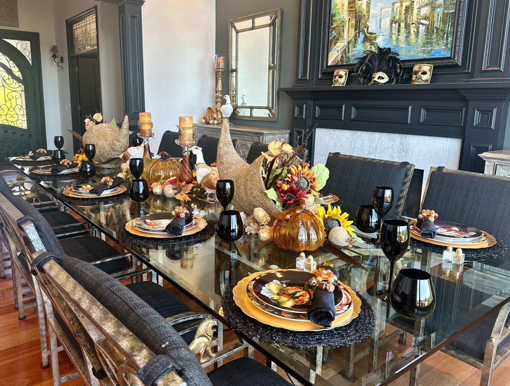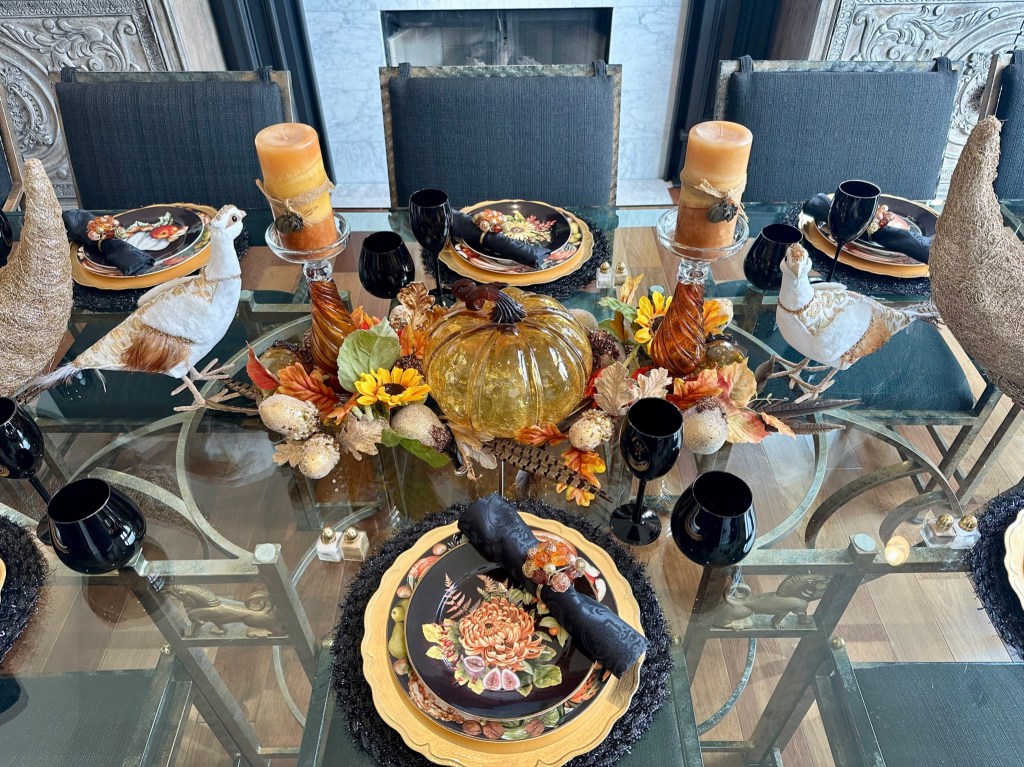 In the Dining Room, I started at the center of the table by filling the cornucopias with randomly placed flower stems, spilling onto the table with a glass pumpkin, more flowers, leaves, acorns, and pears to soften the base. TIP: To fill the deep conical space and provide a base to hold the florals, I used a large gold air plant in the cornucopia. I then created the center arrangement with a large glass pumpkin and glass candlesticks. I placed various theme elements, layering them until it felt connected and balanced. I finished by placing the small pheasants on each side centered between the cornucopias and candlesticks. For the side chests and side table, I made simple groupings of items – repeating details from the table arrangements – a glass pumpkin, a few leaves, a gold acorn pick, and a pear. For the place settings, I started with a black placemat, a gold charger, and then layered the dinner plate and salad plate (William Sonoma discontinued harvest pattern). The black napkin was simply rolled and held by a jeweled napkin ring, then placed at an angle not to hide the place setting patterns. Black glass wine and stemless water glasses finish the settings. I had the option to use gold fabric cushions on the dining chairs, but since I plan to use those this winter, I kept the black dining chair cushions for fall.