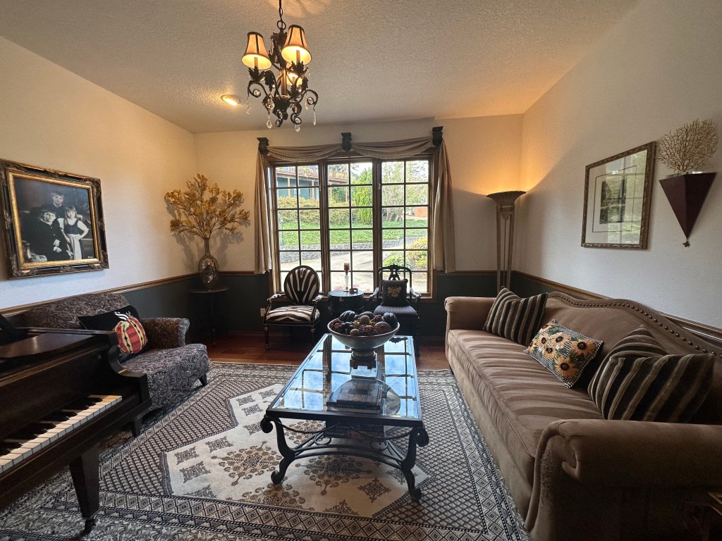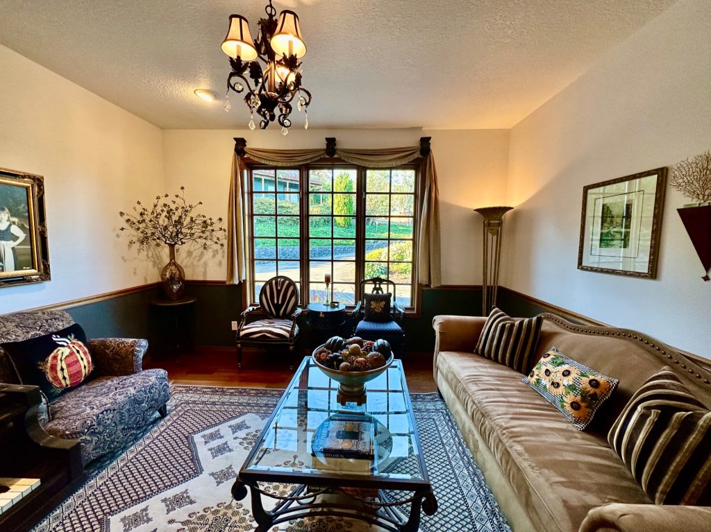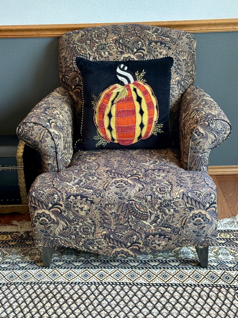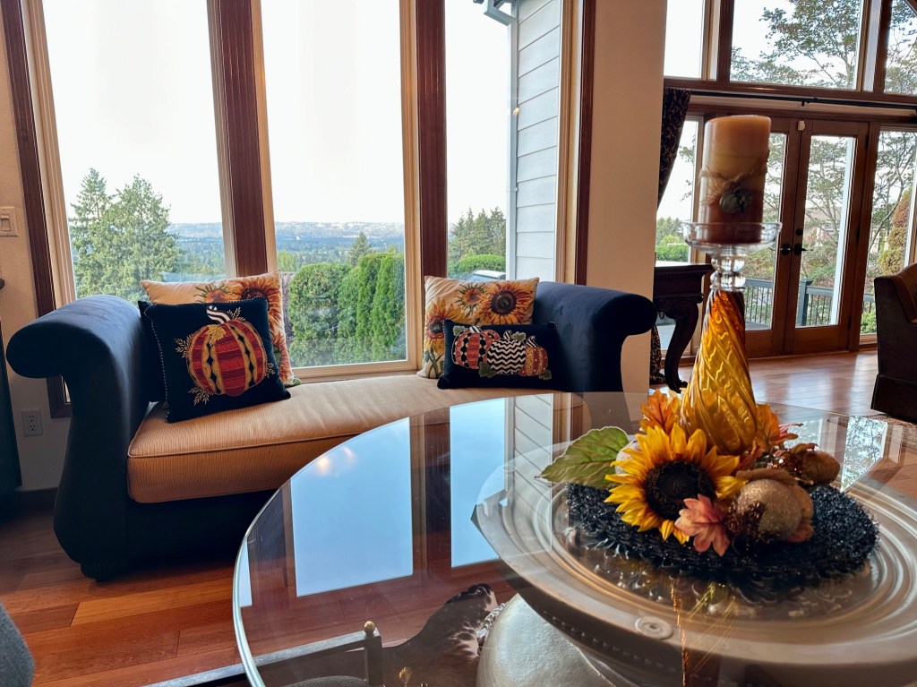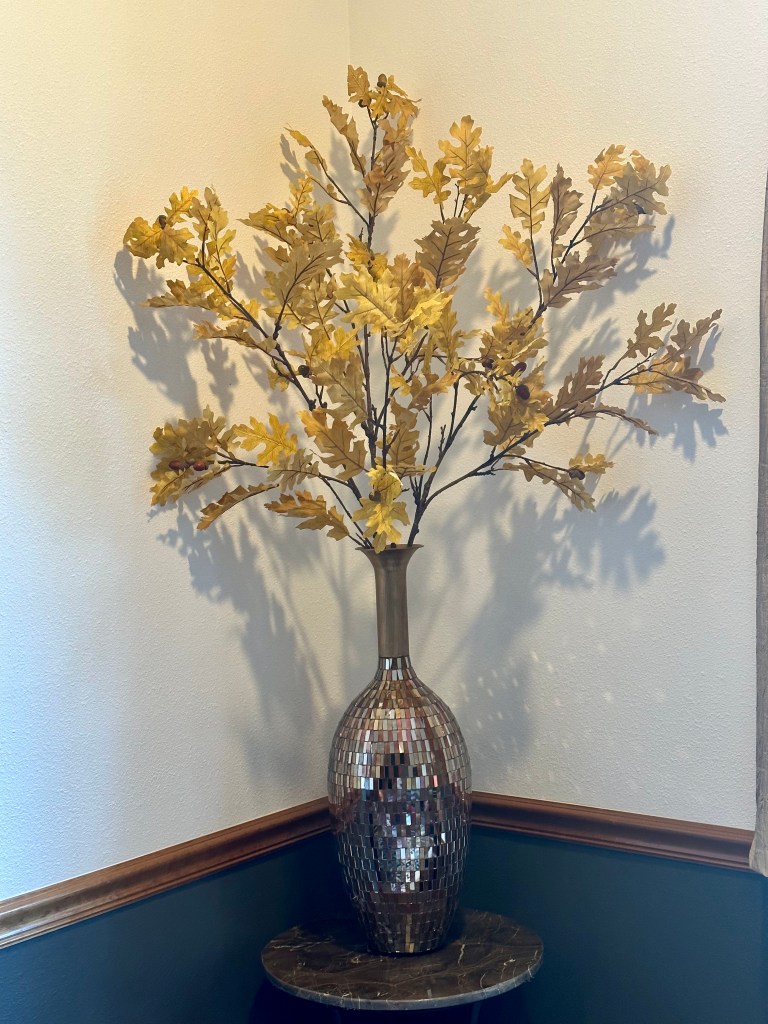 In the Living room, a large sunflower arrangement (a gift from a dear friend a few years ago) and a Mackenzie Childs Gingham Sunflower beaded runner decorate the wine chest. On the coffee table, the large vessel is filled with pumpkins, acorns, pears, and fall orbs. More pumpkin and gingham sunflower pillows accent the chair and couch. I ordered Golden Oak branches for the corner table vase, but since they have not arrived, I left the green branches for now.