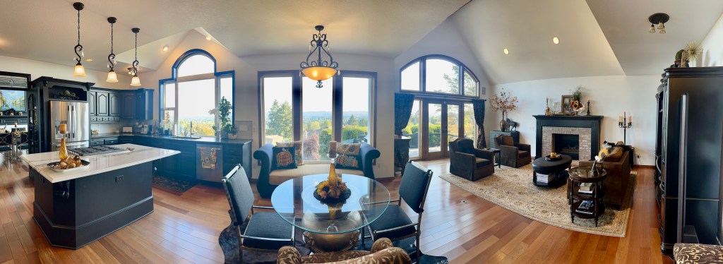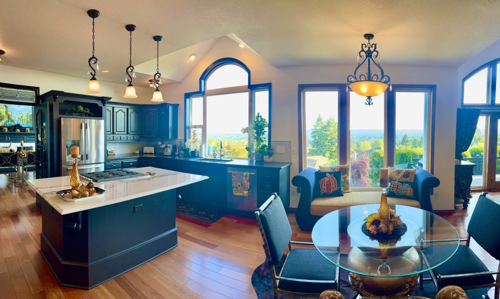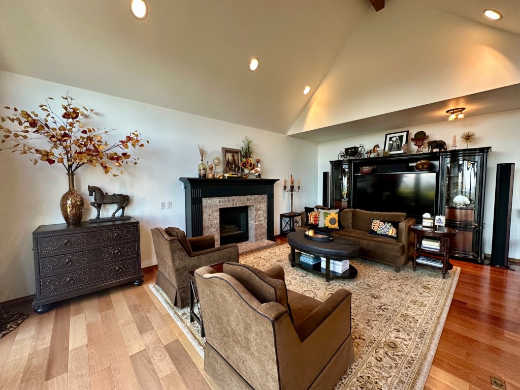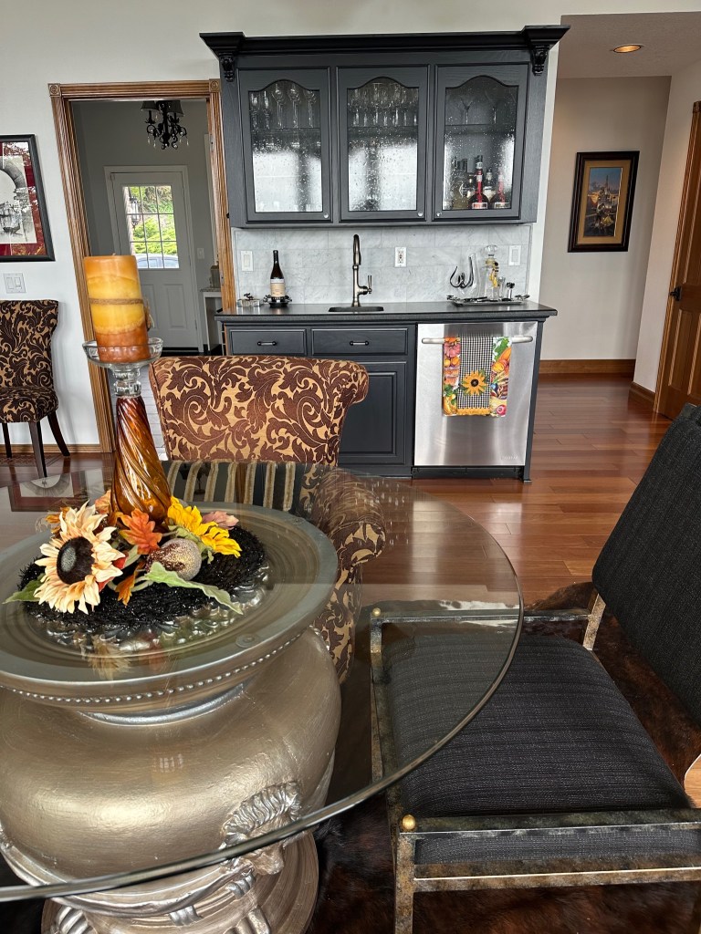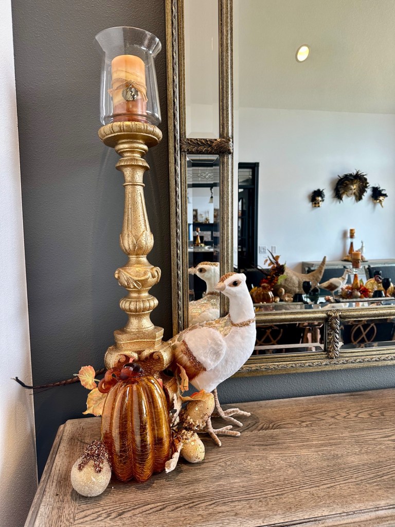 The Bountiful Harvest theme continues into the Greatroom. The fireplace mantel underwent minor changes: The vase arrangement was updated with sunflowers and feathers; a glass pumpkin, gold acorn and a Pheasant repeat accent details from the Dining Room. To the left, the large vase atop the leather chest holds large branches, filling the large wall space with fall colors. To the right, in the large candelabra, I replaced the previously black coach candles with 9″ Root collenette candles in yellow and orange. (I found these for 50% off at Macys with free shipping!) More Mackenzie Childs pumpkin and sunflower pillows on the couch finish the room. I found all the pillows on resale websites for a nice discount off retail – Don’t be afraid to negotiate posted pricing!