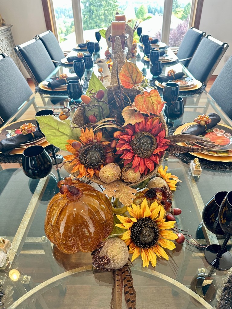 This year I decided to use pumpkins, acorns, pears, and sunflowers to celebrate the colors of yellow and orange for my Fall seasonal decor. I decided not to give a how-to description of building the arrangements and tablescape. You can look back at my previous posts for step by step inspiration.