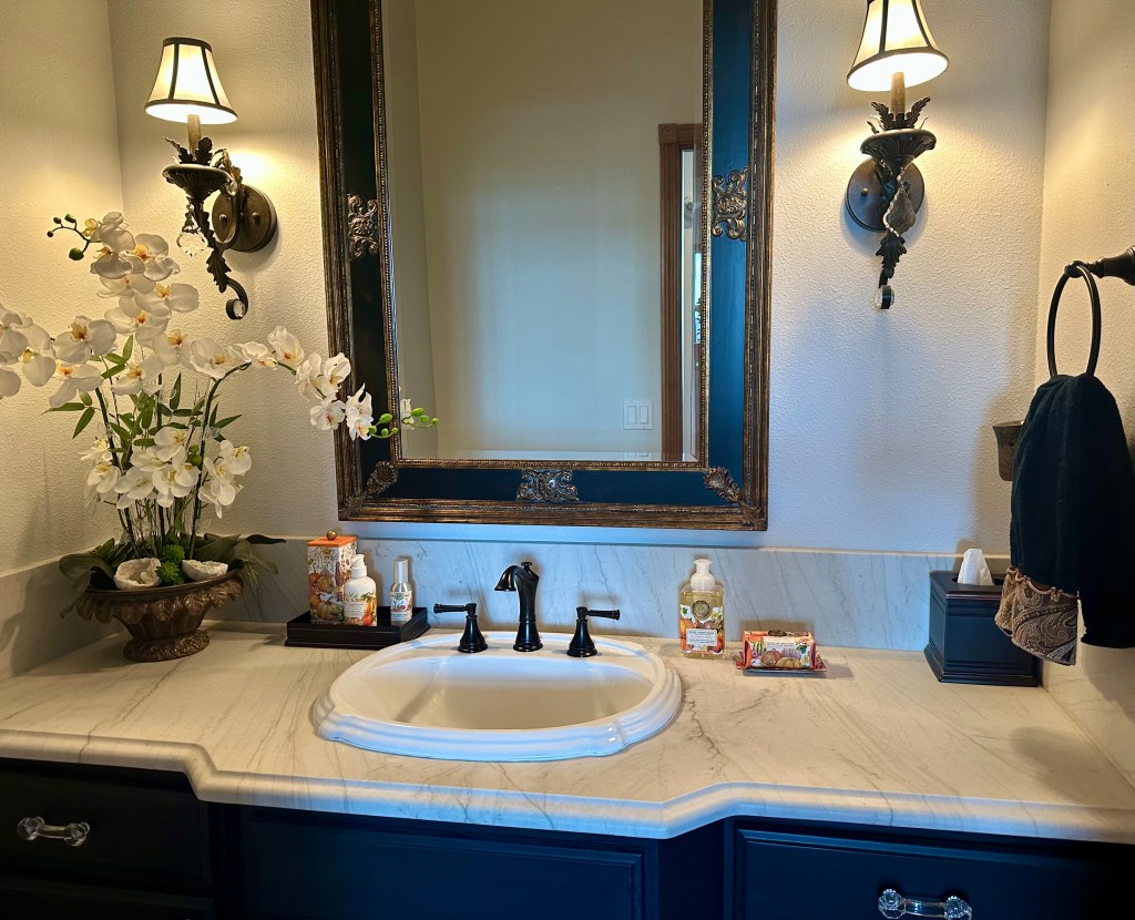 In the guest bath, room spray and hand soaps repeat the theme. These small details bring a cohesiveness to the entire home.