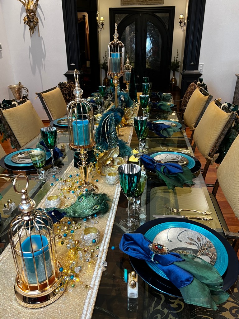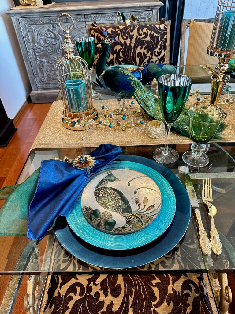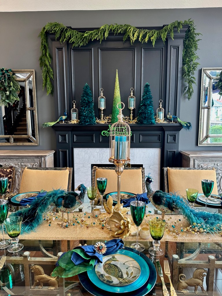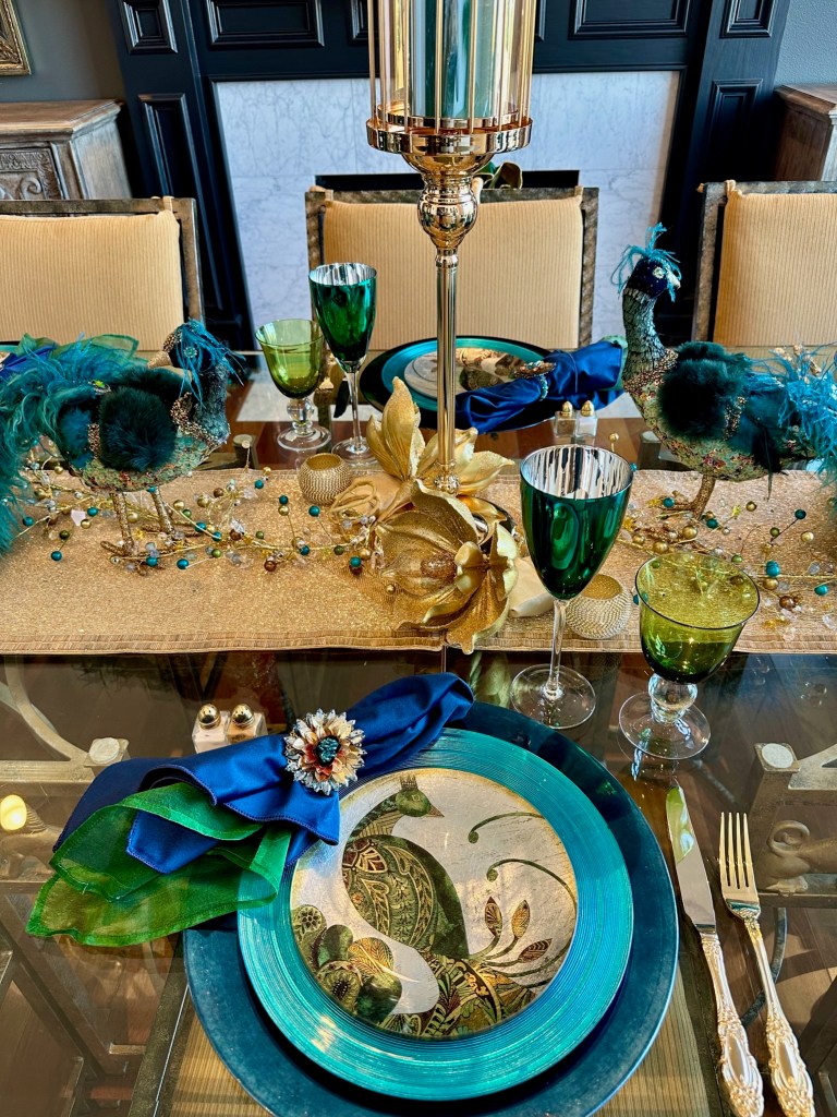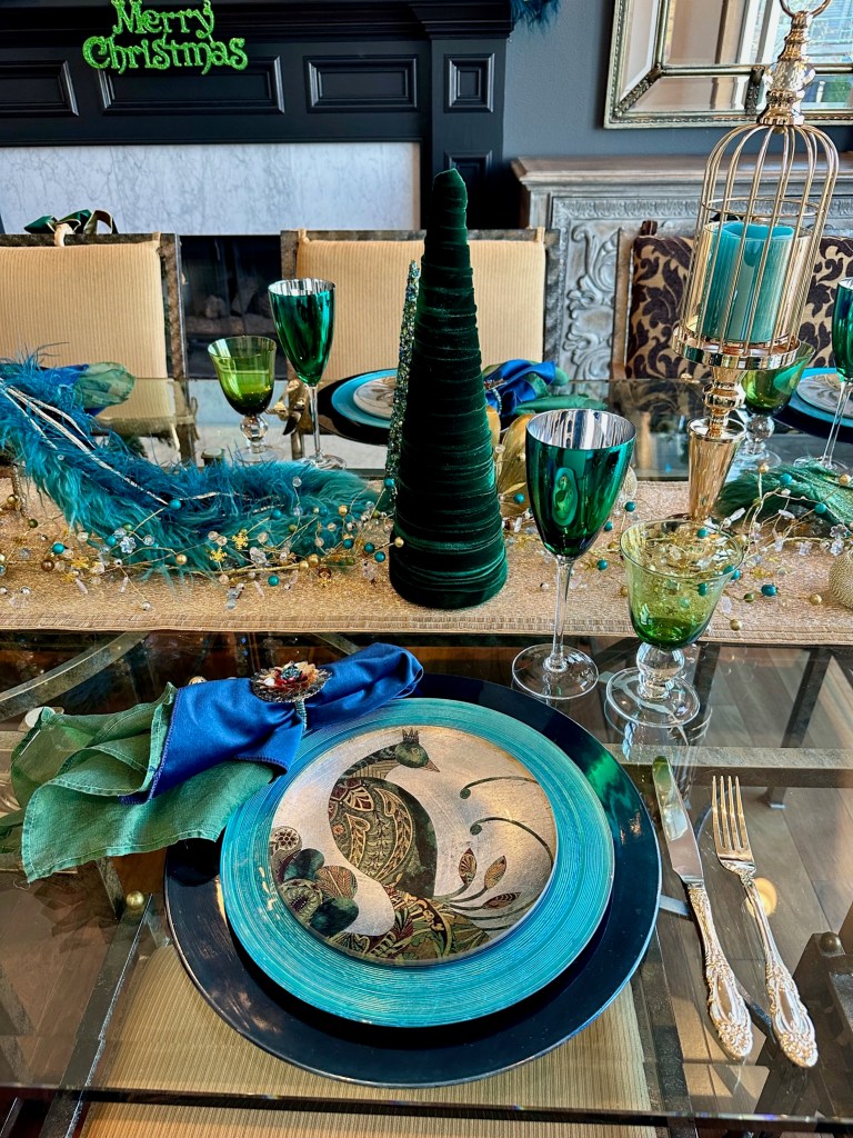 Products and Sources: I first used this decor theme in 2011 and I have been sourcing over the last few years in preparation, so many items are no long available. Dinner plates, salad plates, wine glasses, beaded garland, teal tree peacocks, and larger ornaments from Pier1 and discontinued; beaded table runners, peacock napkin rings from Zgallerie; Merry Christmas Ribbon from Michaels; wide green ribbon, various ornaments from Christmas Central; D. Stevens teal reversible velvet/glitter ribbon, ombré green sparkle cone trees from Horchow; Chair greenery swags, peacock stockings from Frontage; smaller glass peacock themed ornaments from Hobbylobby; Birdcage candle stands from Galore Home; wall-hanging greenery tree, green velvet and teal feather cone trees from Grandinroad; Raz Gold magnolia floral stems from Alsip Nursery; larger peacocks sourced from various collectable online stores; Hand soaps and kitchen towels from Michel Design Works.