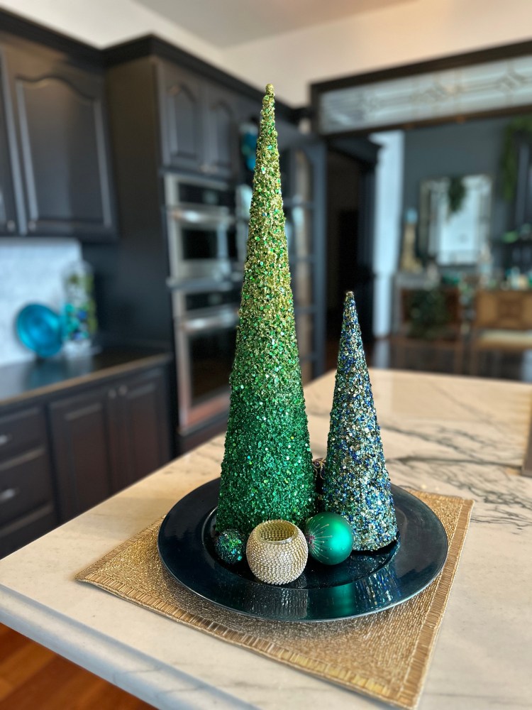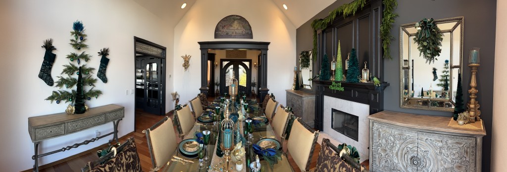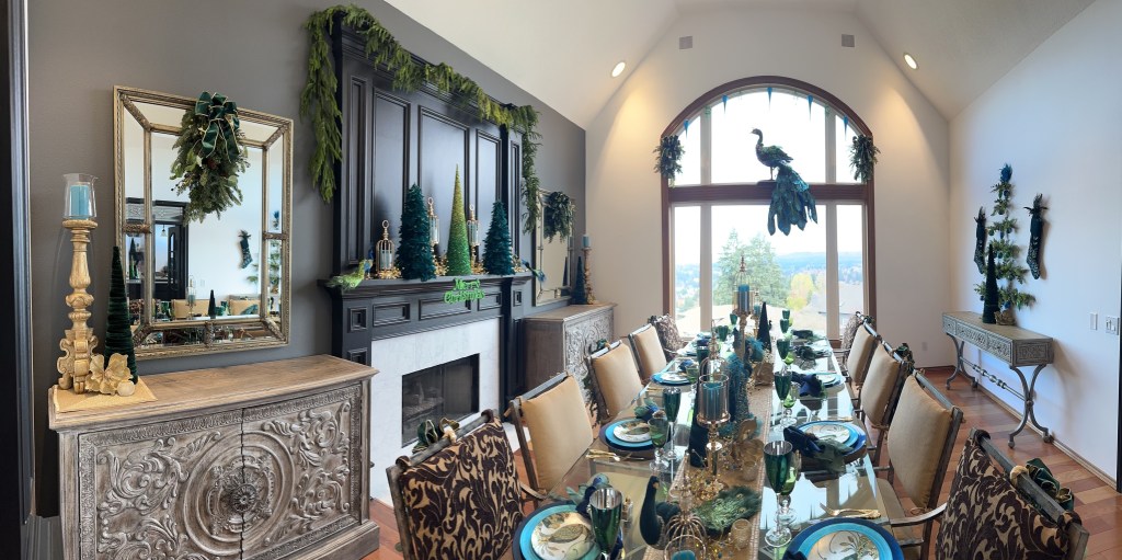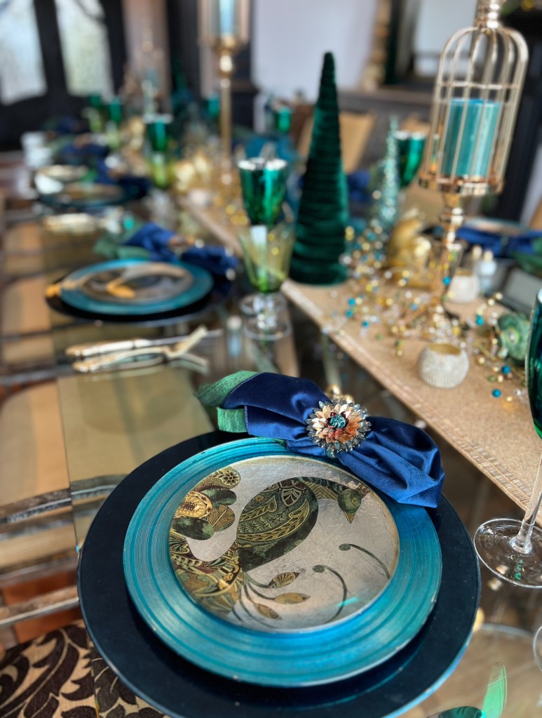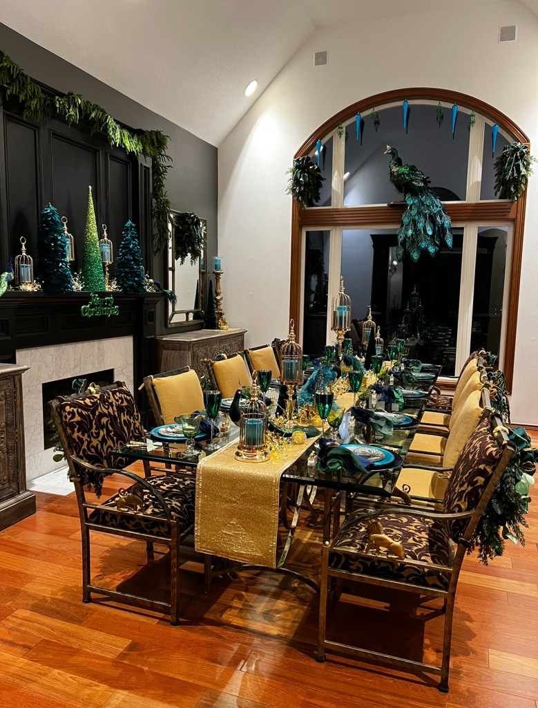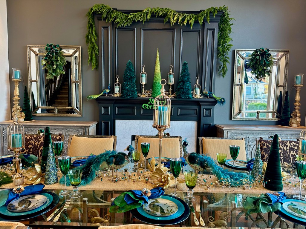 Products and Sources: I first used this decor theme in 2011 and I have been sourcing over the last few years in preparation, so many items are no long available. Dinner plates, salad plates, wine glasses, beaded garland, teal tree peacocks, and larger ornaments from Pier1 and discontinued; beaded table runners, peacock napkin rings from Zgallerie; Merry Christmas Ribbon from Michaels; wide green ribbon, various ornaments from Christmas Central; D. Stevens teal reversible velvet/glitter ribbon, ombré green sparkle cone trees from Horchow; Chair greenery swags, peacock stockings from Frontage; smaller glass peacock themed ornaments from Hobbylobby; Birdcage candle stands from Galore Home; wall-hanging greenery tree, green velvet and teal feather cone trees from Grandinroad; Raz Gold magnolia floral stems from Alsip Nursery; larger peacocks sourced from various collectable online stores; Hand soaps and kitchen towels from Michel Design Works.