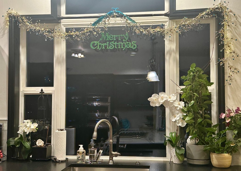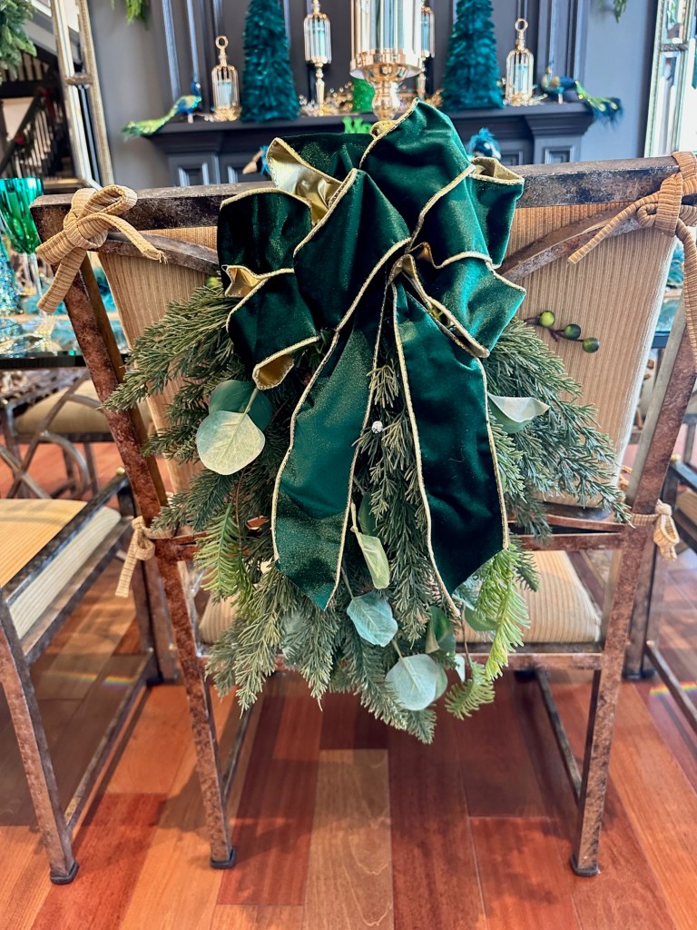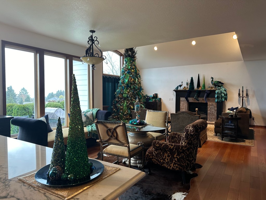 The Dining Room: I started by changing my chair pads to the original gold fabrics. This decor design came together fairly fast as there are no floral arrangements. It was a simple matter of placing items in a manner to bring interest and balance. Initially, after placing the table runner, birdcage candle stands, peacocks and cone trees, it looked good. Then, when I added the beaded garland, it brought dimension and movement to the centerpiece. It also connected the individual elements to give a unified feel. Don’t be afraid to try different combinations or layering of items to develop a centerpiece. If you don’t like it, remove it! The final touch was adding the gold bling votives and the wire lights to bring romantic ambience in the evening hours. To secure the large peacock, I used an acrylic disk and drilled it into the window trim. No one will ever see those holes. As not to damage the collectible peacock, I used Velcro tape to secure the peacock base to the acrylic and it is very stable. I decided not to hang stockings on the mantel, instead placing them on the large opposite walI on each side of the simple wall-hanging greenery Christmas tree. A small feather pick hides the hook. Knowing the theme would not have greenery, I planned on using the chair swags. After having one on each chair, the mirrors and arch window seemed bare, so I removed every other one from the chairs to better balance the room with greenery. I tried various peacocks in the corner candlestick and velvet cone tree grouping. It just drew too much attention away from the fireplace and table scape, so I removed those and opted for one gold magnolia flower. I had the room finished and thought it looked nice, but last minute I decided to place the Norfolk garland across the top of the high overmantel. Not only did it seem to better finish the fireplace wall, it also created more drama by drawing the eye up the height of the room. It gave weight and importance to the fireplace and provided better balance to the large window and high decor located there. And Christmas is all about the greenery! The candles are real wax battery operated and on a timer so lighting them is easy!
