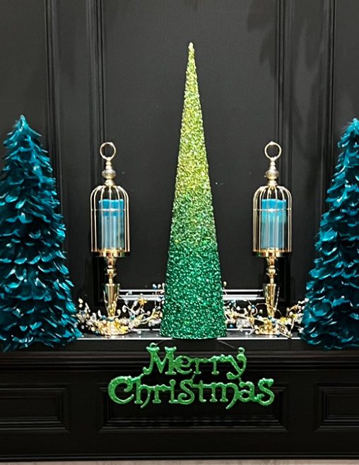 The Great Room: For the tree, I started by placing the ribbons. Using two strands of reversible teal ribbon (one side velvet, the other glitter) and one light green strand embroidered with “Merry Christmas” in the middle, I tied them together leaving “bow loops” at the top end. I attached them to be front and center. As I worked it down the tree, I tucked and tied them to the branch using pipe cleaners, twisting the outside ribbons to reverse the velvet and glitter each section. When completed, I placed a shorter blue with gold on each side of the center green ribbon. Next, I made a “bow loop” at the top of the wide green sequence ribbon, and ran it down each side of the tree. Again, I tucked and tied it to the branches. Finally, I repeated the triple ribbon at the back section on each side.