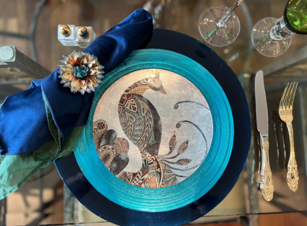 The place settings are a blue charger, teal glass dinner plate, and a peacock salad plate. Layered blue and green napkins simply pinched in the center and pulled through a ring are placed at an angle.