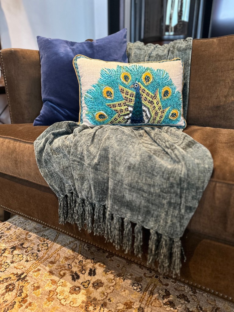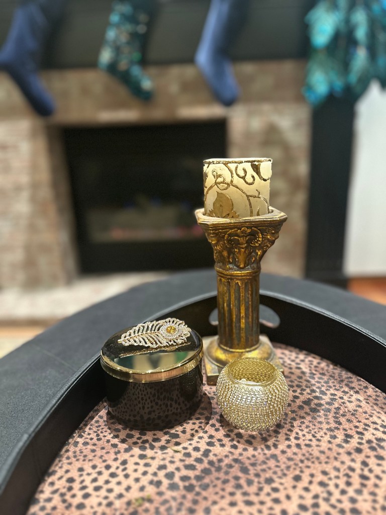 The mantel was quick and easy by placing the various items as I had done in the dining room and then I hung the stockings. I changed out the pillows to blue velvet, added the peacock pillows, and finished with a throw on each couch. I found the peacock wrapping paper as well as some wood ornaments as a small gift for visitors or special gift tags on some of the presents.