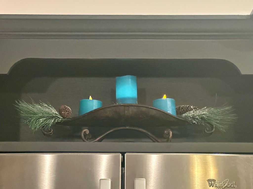 TIP: To not damage the wood, I use 3M Command wall hooks (colored with black sharpies) to secure or hang things on the mantels.