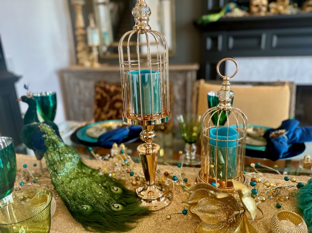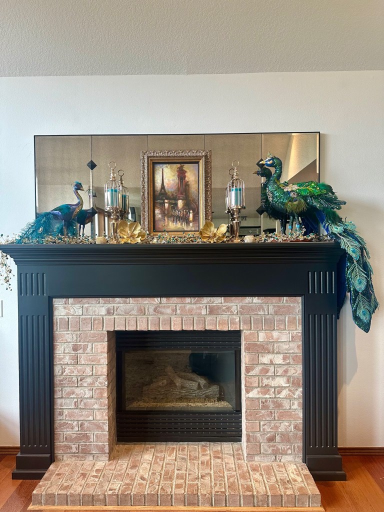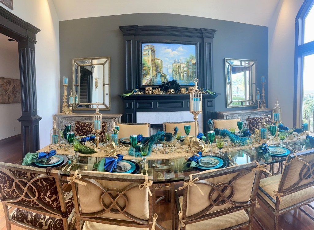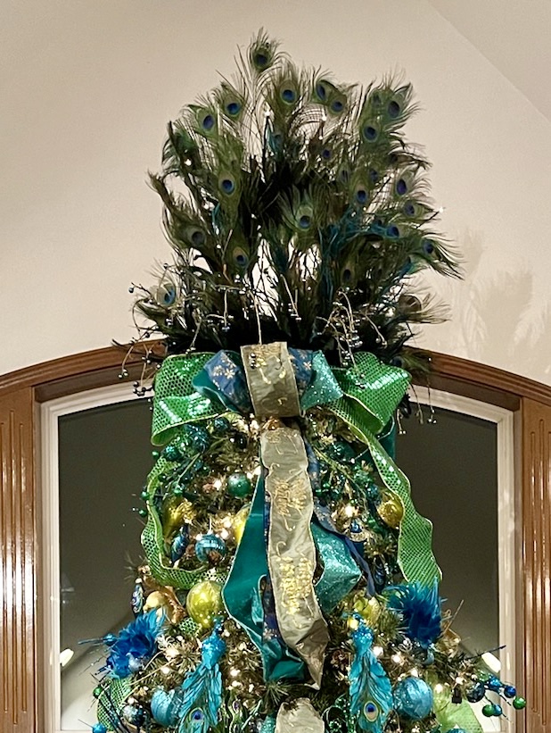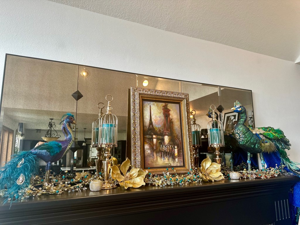 I usually enjoy my Christmas decor for an additional week after the New Year and then take it all down. I then decorate for our annual February formal dinner party. Each year I choose a country to focus the theme on their Mardi Gras traditions, food, wine, and music. For an example, see my previous blog articles Venetian Carnevale and Fasching Party. Due to some health issues, we had to cancel the party. I didn’t have the energy to take down the Christmas decor and transition to an entirely new look, so I made the decision to simplify the peacock look for Winter and early Spring. I also hired a friend to help me with the work and putting things away.