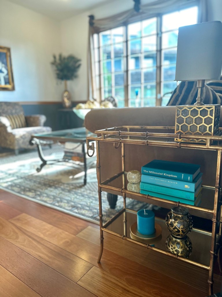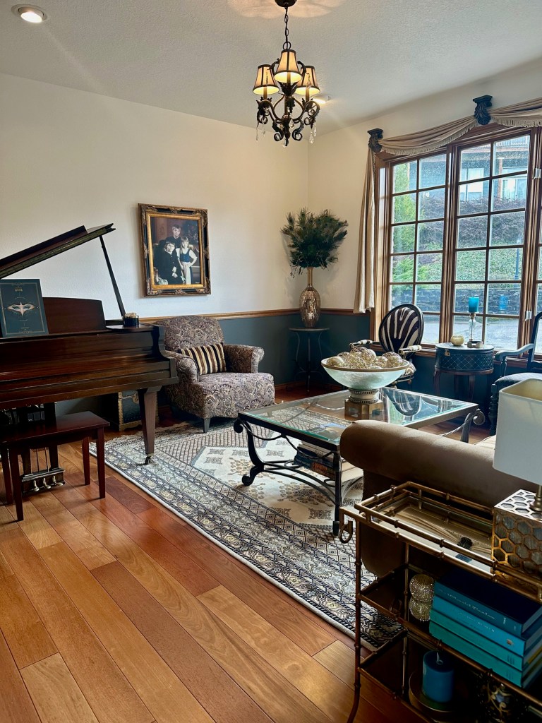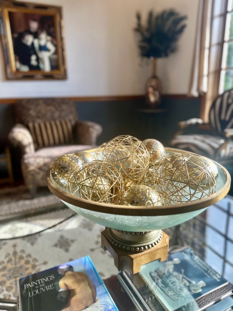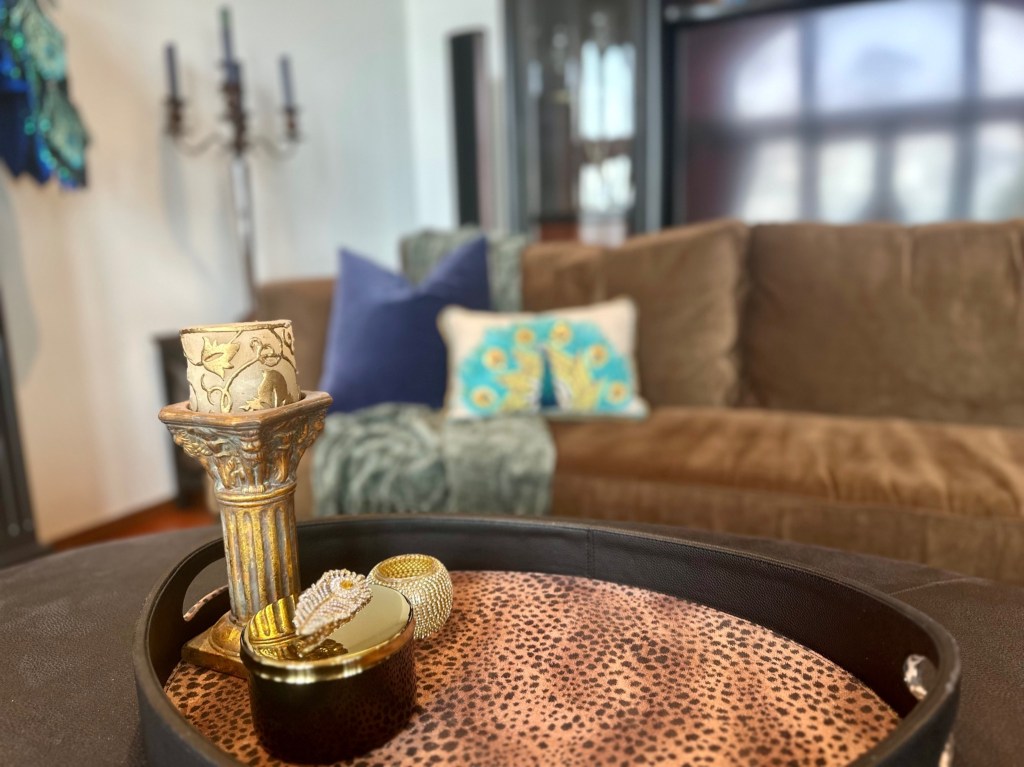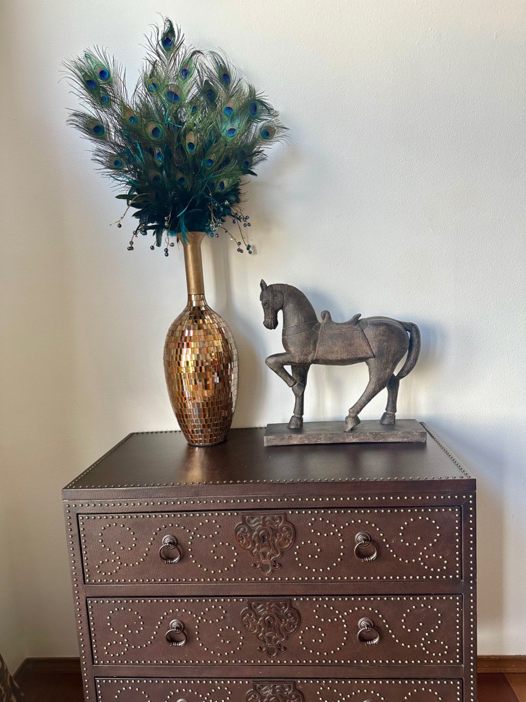 I usually enjoy my Christmas decor for an additional week after the New Year and then take it all down. I then decorate for our annual February formal dinner party. Each year I choose a country to focus the theme on their Mardi Gras traditions, food, wine, and music. For an example, see my previous blog articles Venetian Carnevale and Fasching Party. Due to some health issues, we had to cancel the party. I didn’t have the energy to take down the Christmas decor and transition to an entirely new look, so I made the decision to simplify the peacock look for Winter and early Spring. I also hired a friend to help me with the work and putting things away.