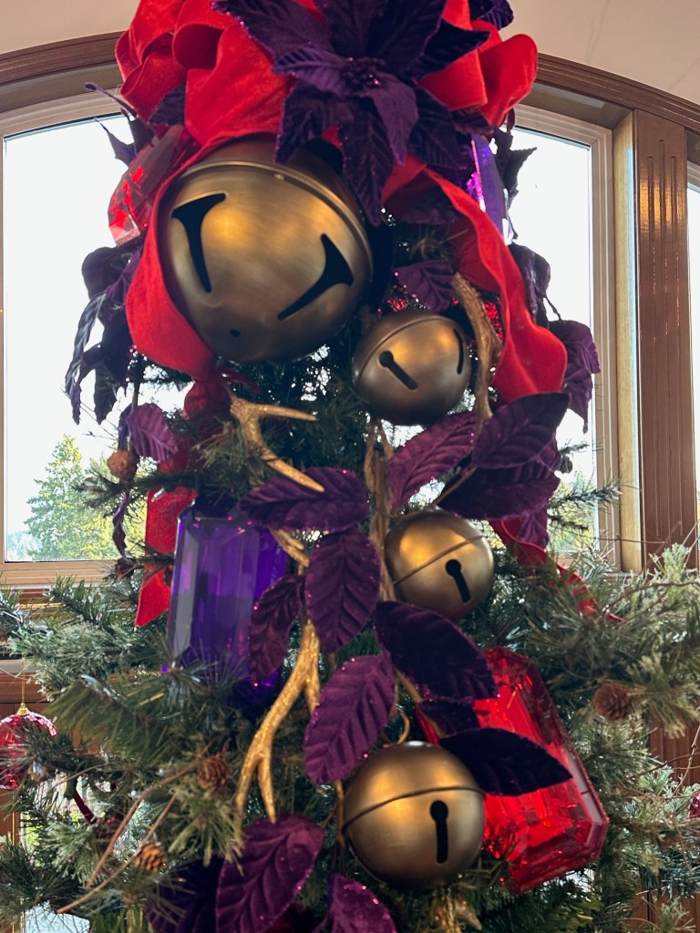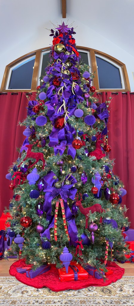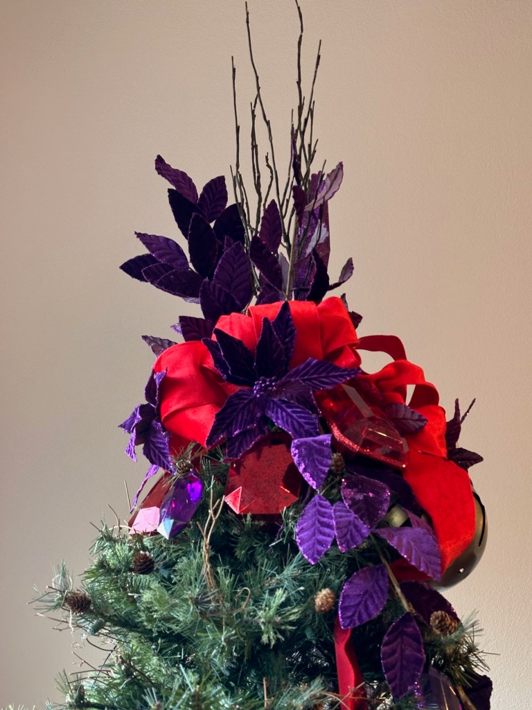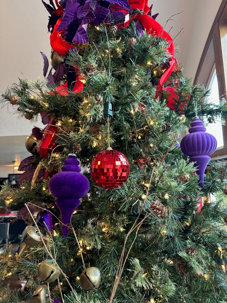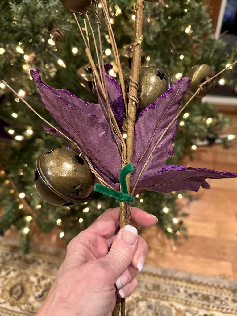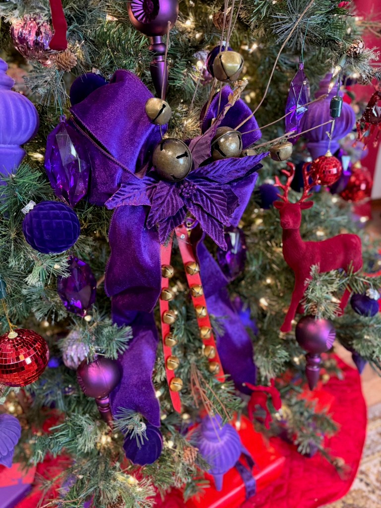 I combine a jingle bell spray with a purple poinsettia, red “leather” jingle bell door hanger (removing the greenery attached) and place the grouping in a balanced fashion around the mid and lower part of the tree. I later add a purple velvet bow for more definition and impact.
