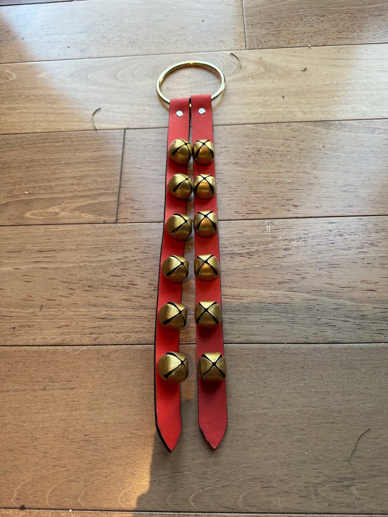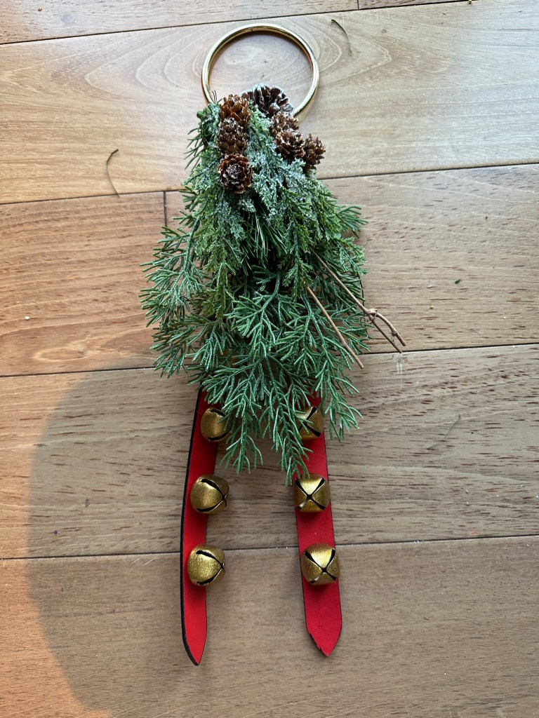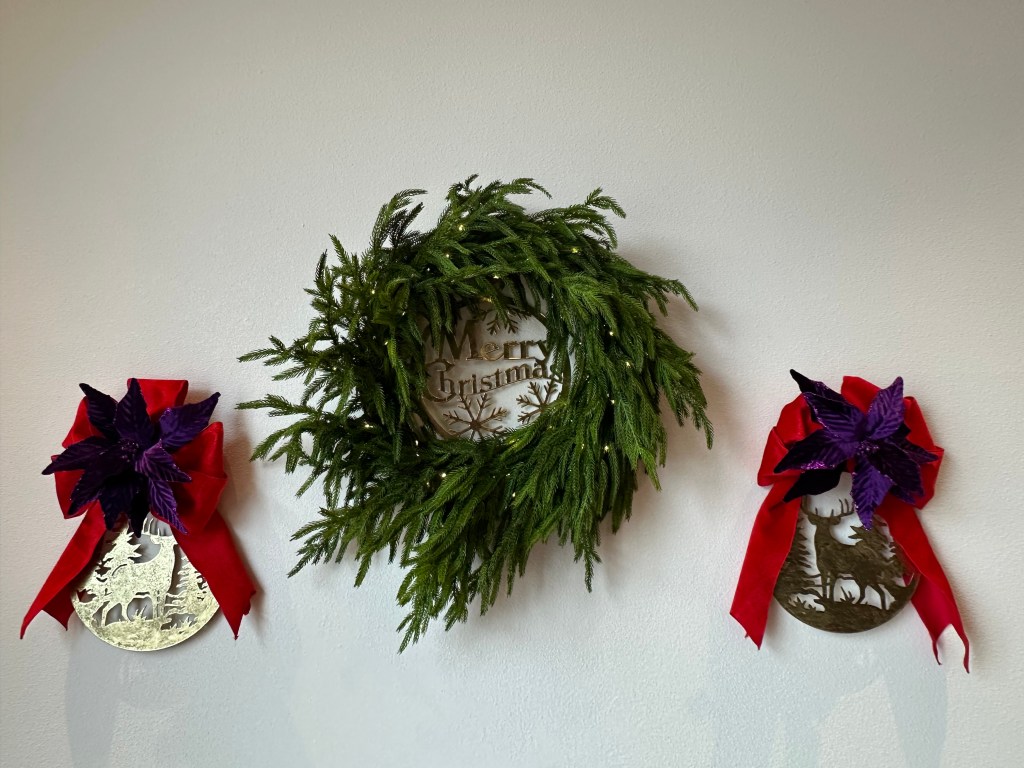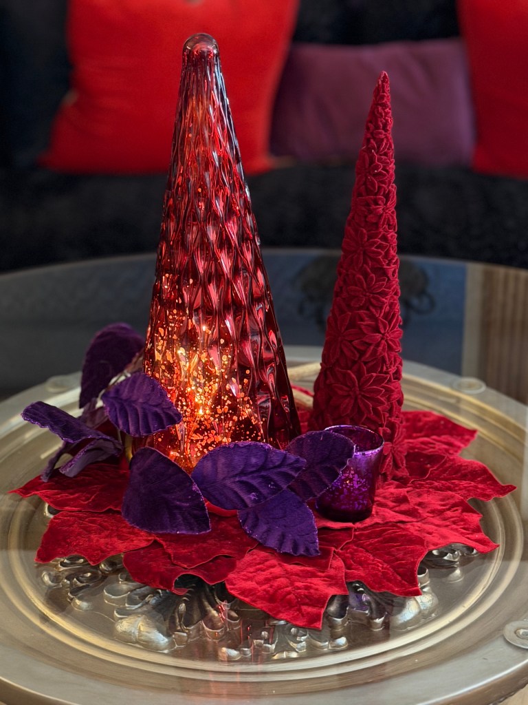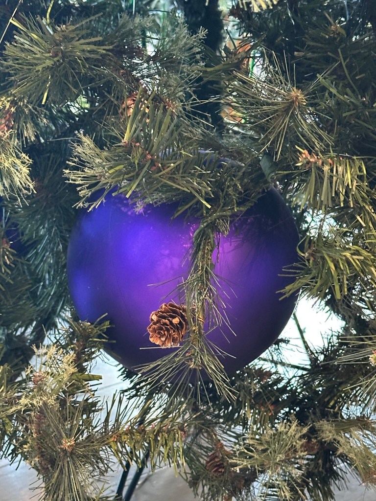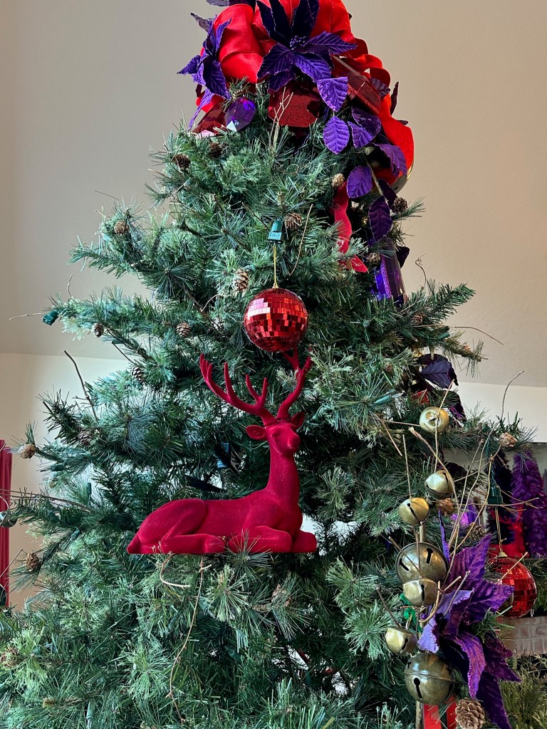 I combine a jingle bell spray with a purple poinsettia, red “leather” jingle bell door hanger (removing the greenery attached) and place the grouping in a balanced fashion around the mid and lower part of the tree. I later add a purple velvet bow for more definition and impact.