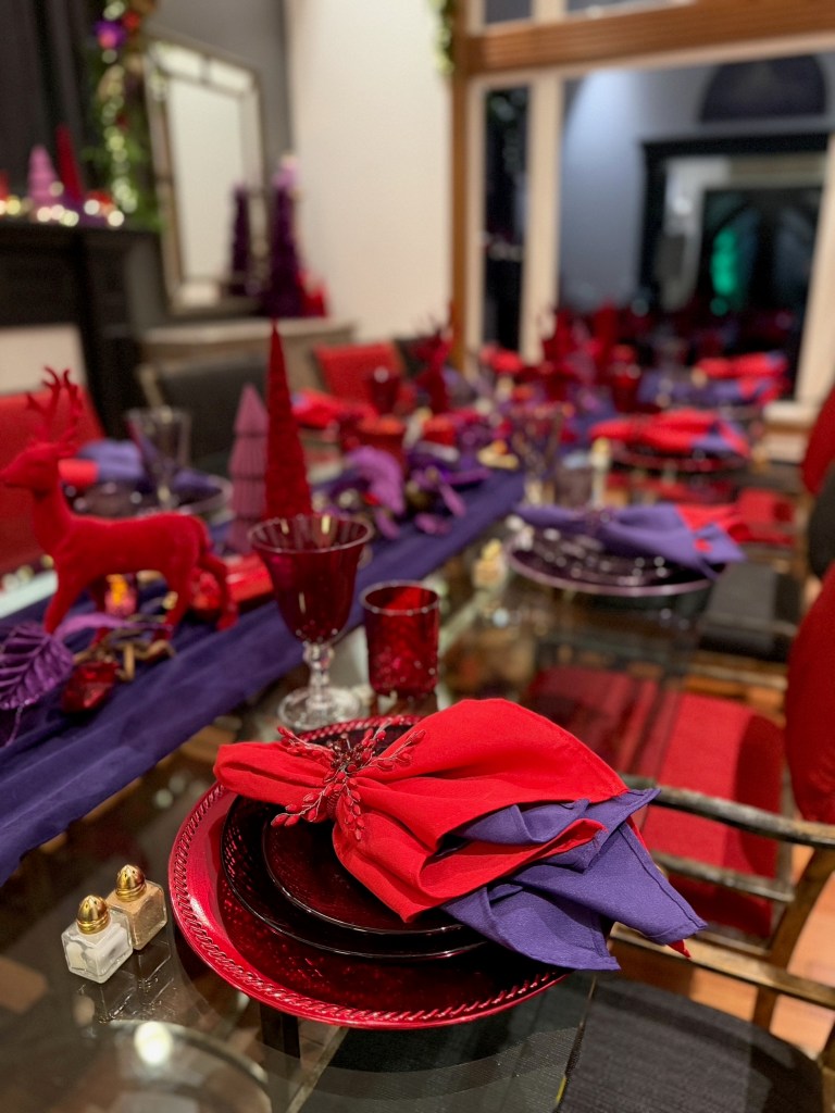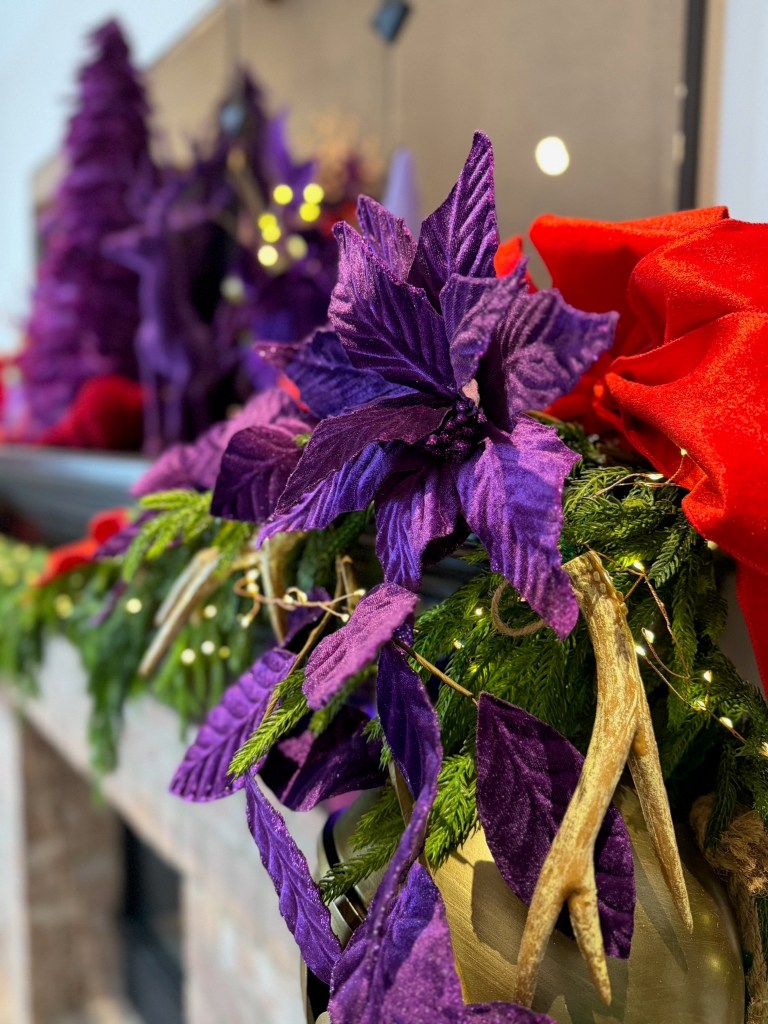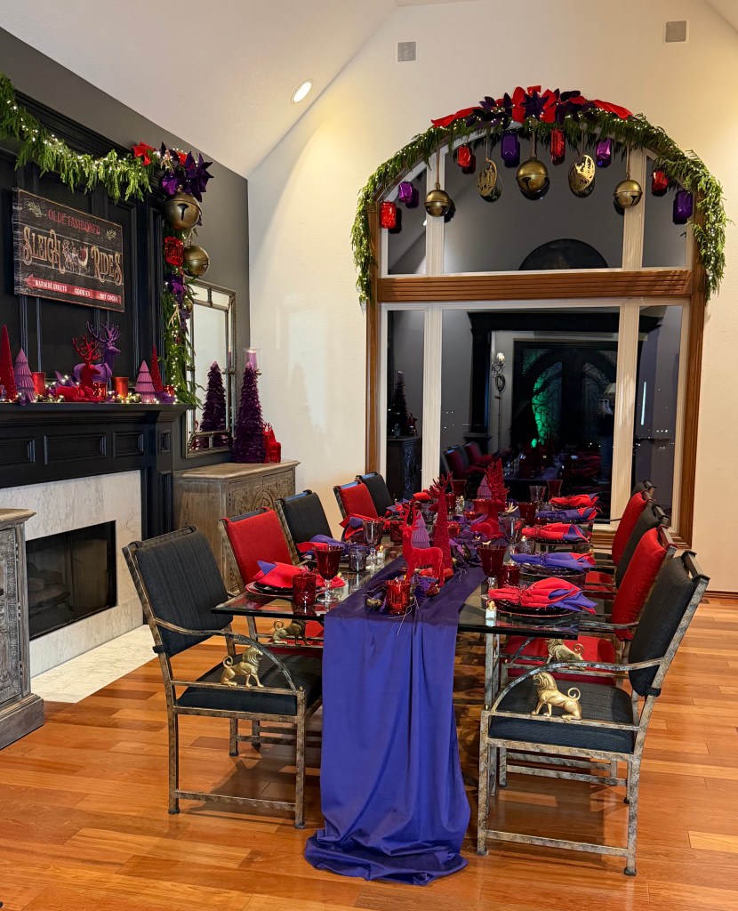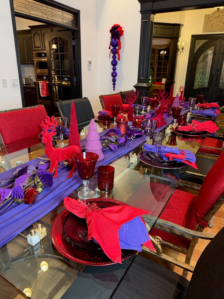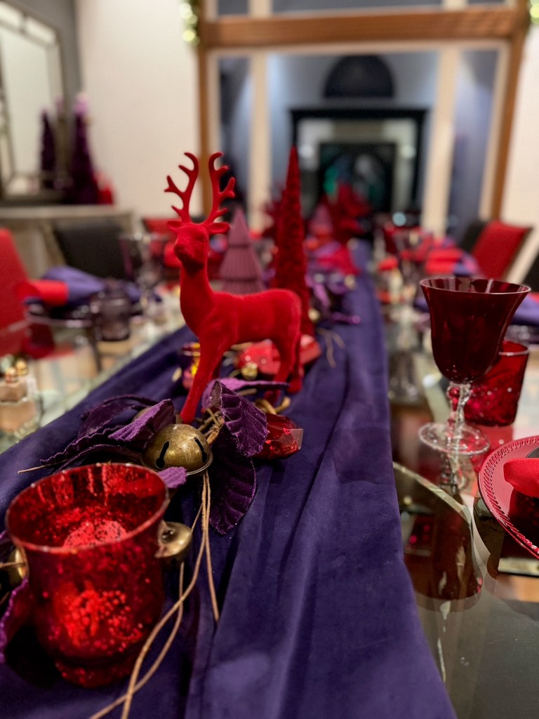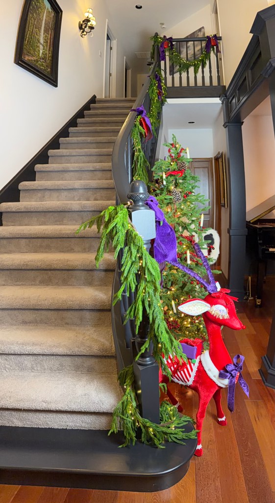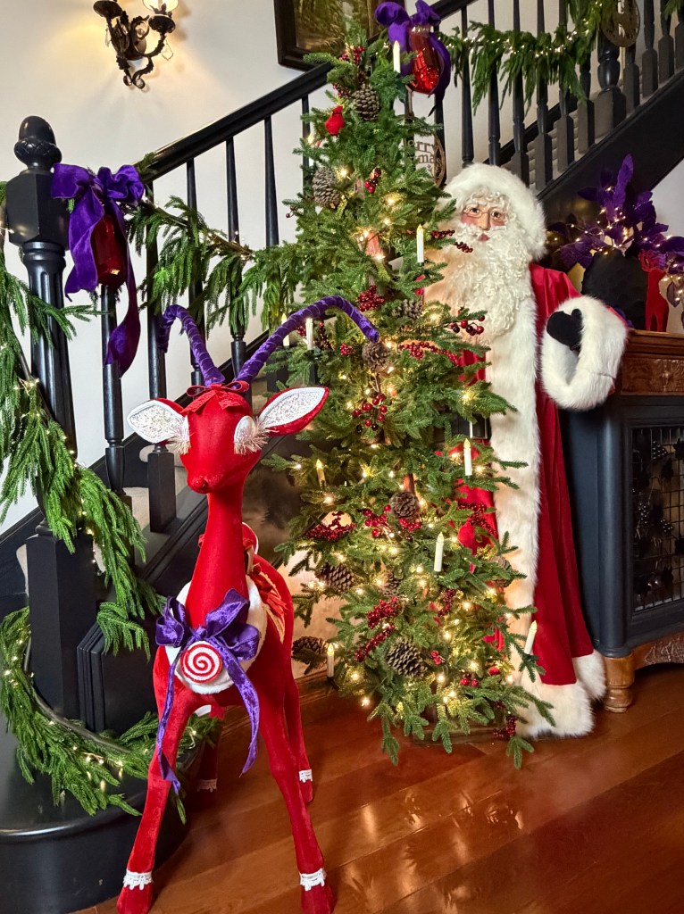 In the Foyer, it takes two 15′ Norfolk garland and three 20′ fairy lights to drape the bannister. Large purple velvet 4″ ribbon bows top large red gems and brass medallions. At the base of the stairs, a playful red deer stands with Santa and his tree. Behind on the chest sits a vase grouping with purple velvet leaves, a red flocked deer and large purple finial ornament sitting atop a red velvet poinsettia placemat. NOTE: I originally used the Mark Roberts red deer in the dining room for Peppermint Elves theme, and altered its look by removing the desserts and replacing with a wrapped present and red bows, and wrapping the antlers with purple velvet ribbon.