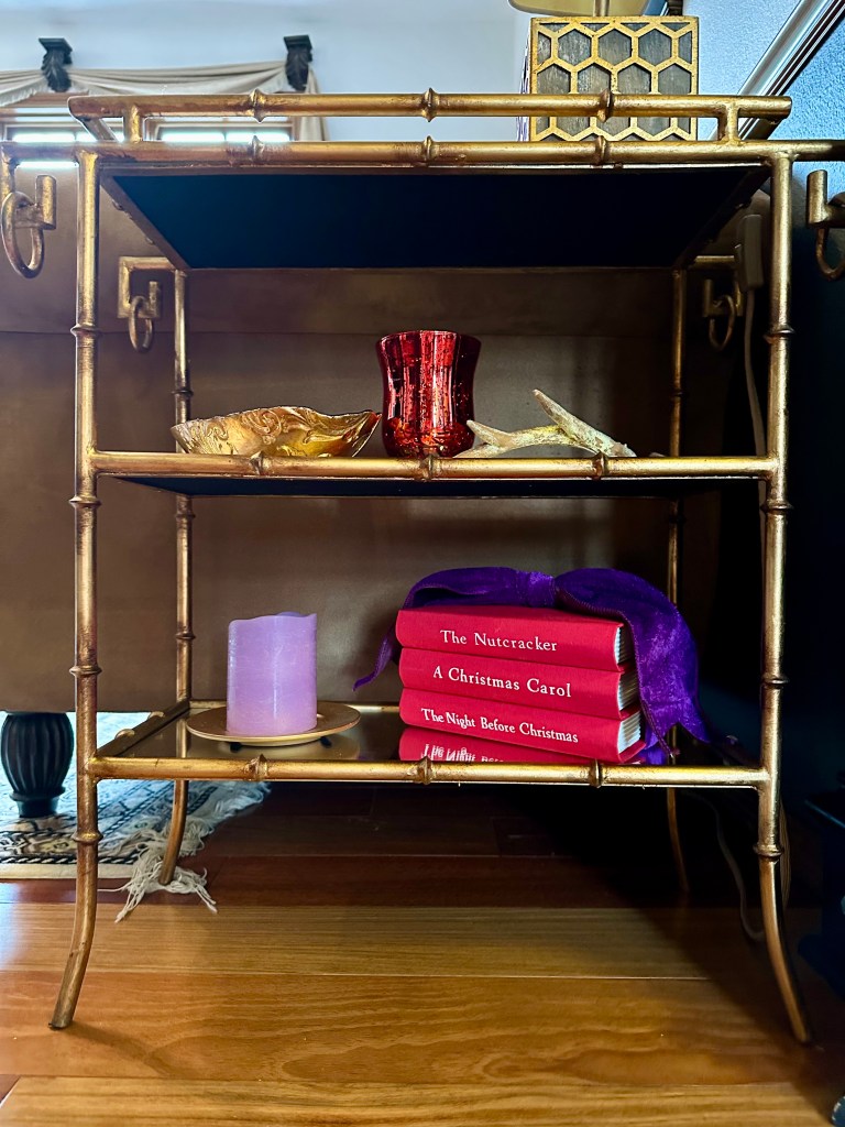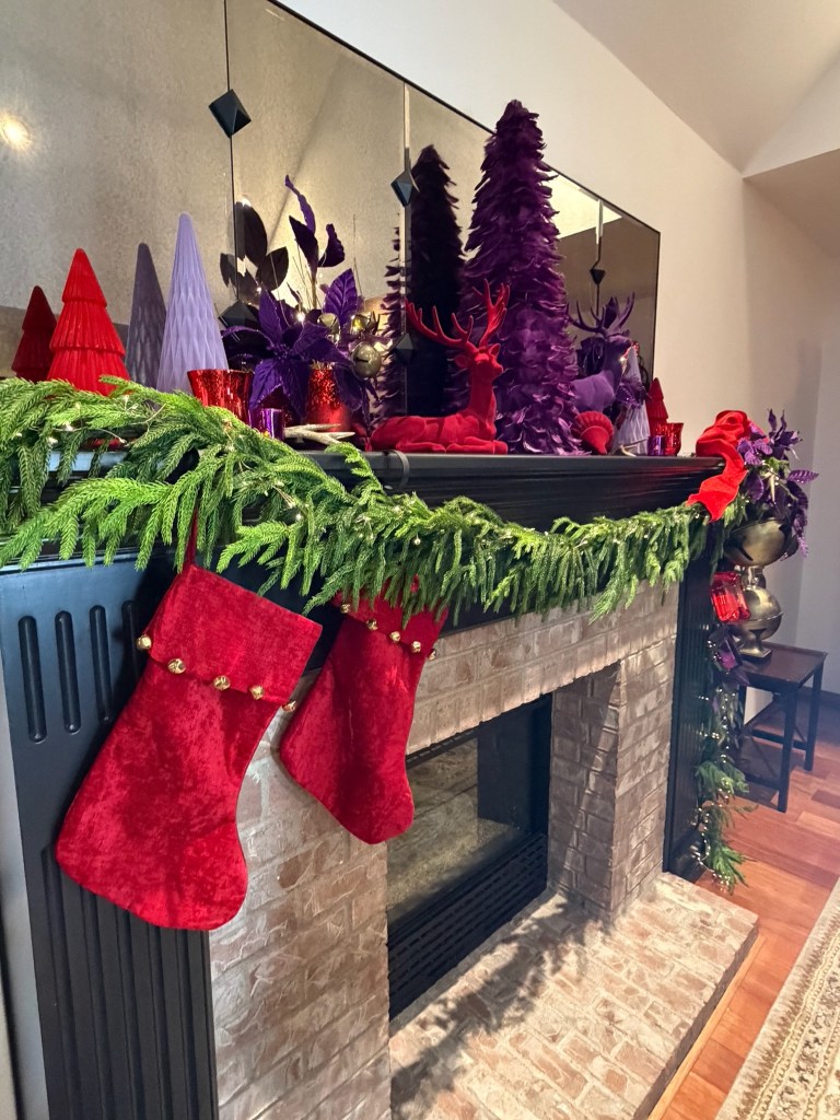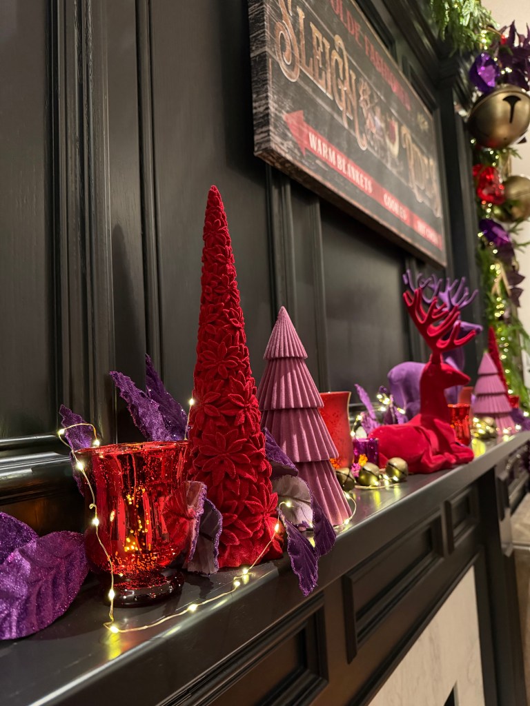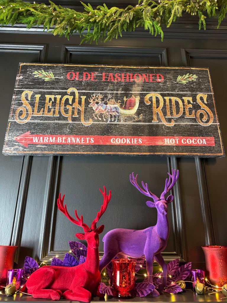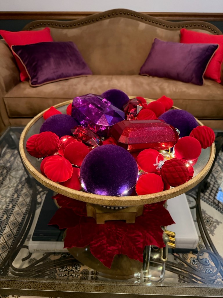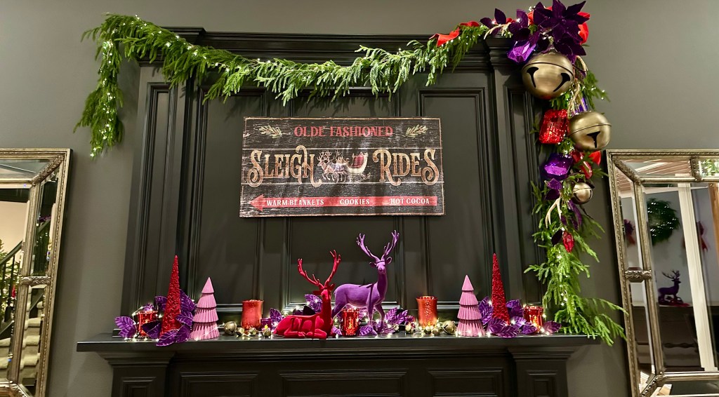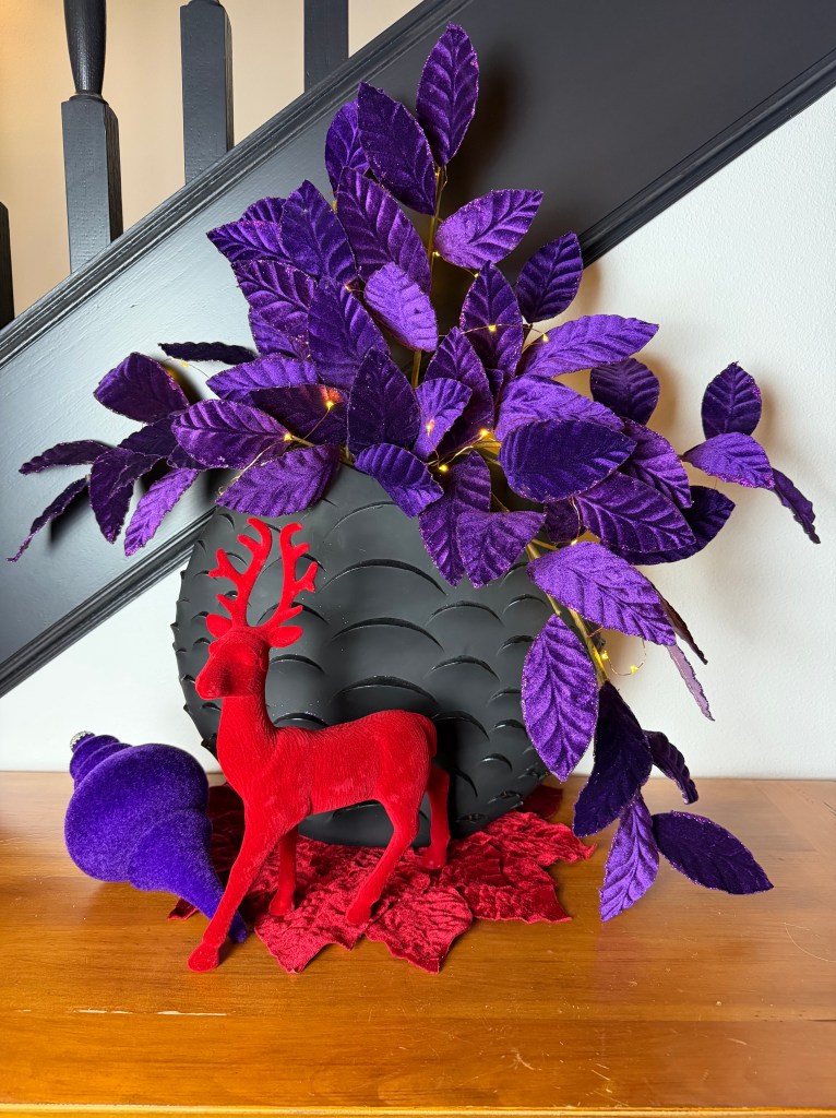 In the Foyer, it takes two 15′ Norfolk garland and three 20′ fairy lights to drape the bannister. Large purple velvet 4″ ribbon bows top large red gems and brass medallions. At the base of the stairs, a playful red deer stands with Santa and his tree. Behind on the chest sits a vase grouping with purple velvet leaves, a red flocked deer and large purple finial ornament sitting atop a red velvet poinsettia placemat. NOTE: I originally used the Mark Roberts red deer in the dining room for Peppermint Elves theme, and altered its look by removing the desserts and replacing with a wrapped present and red bows, and wrapping the antlers with purple velvet ribbon.