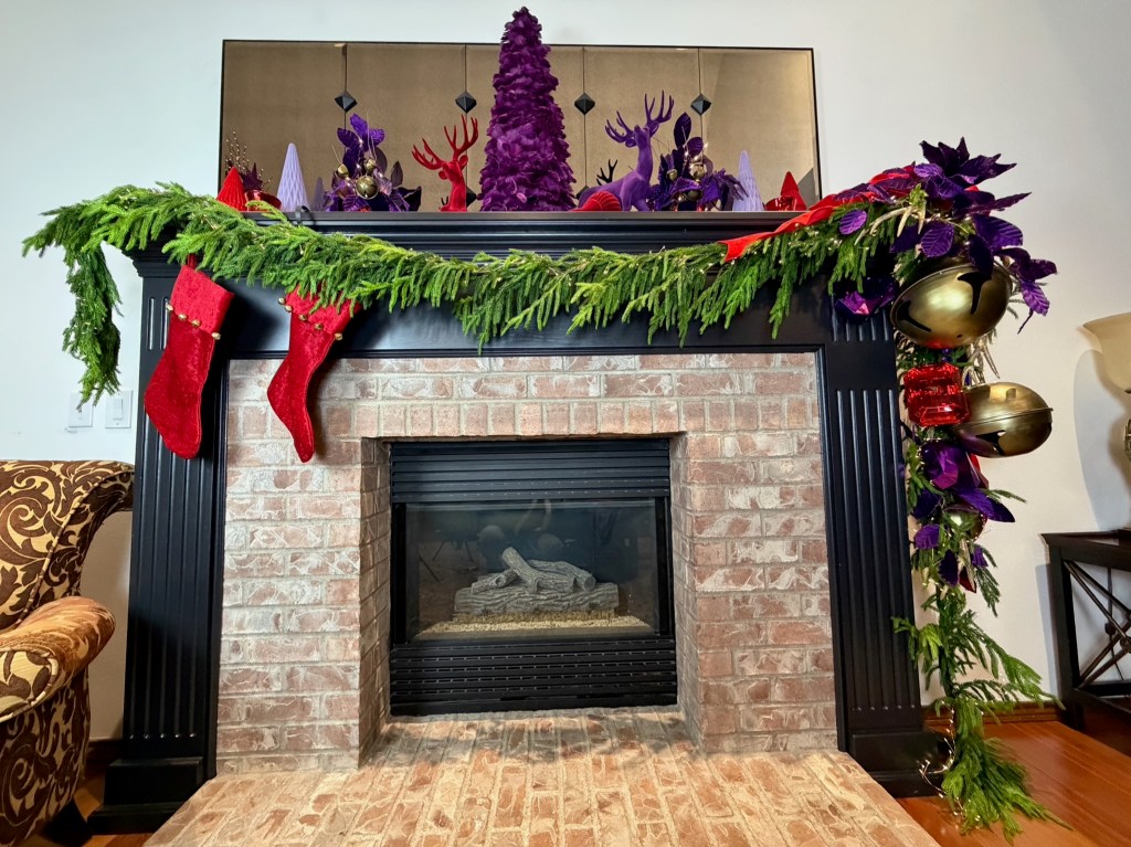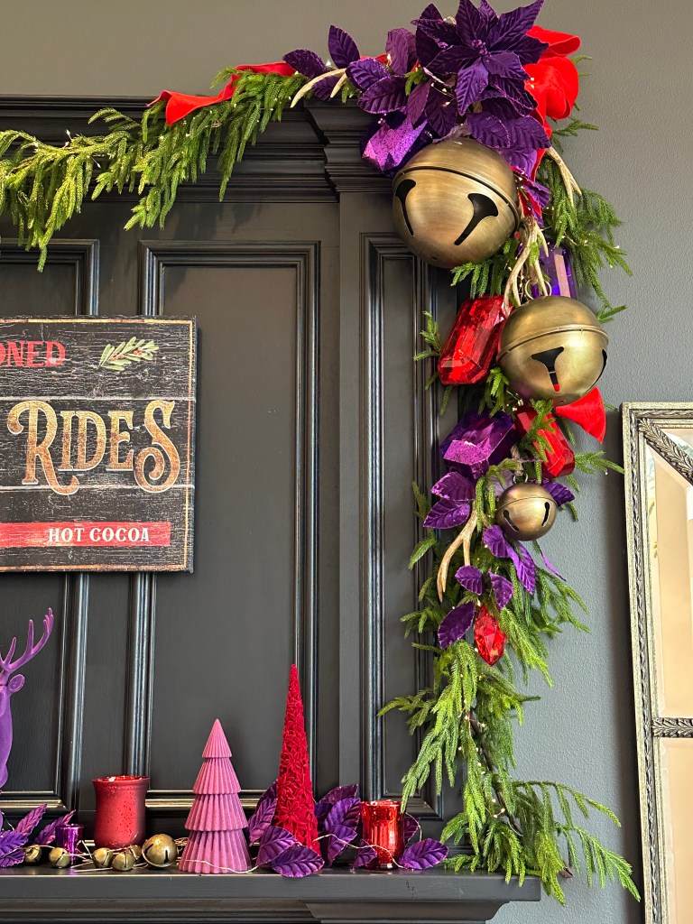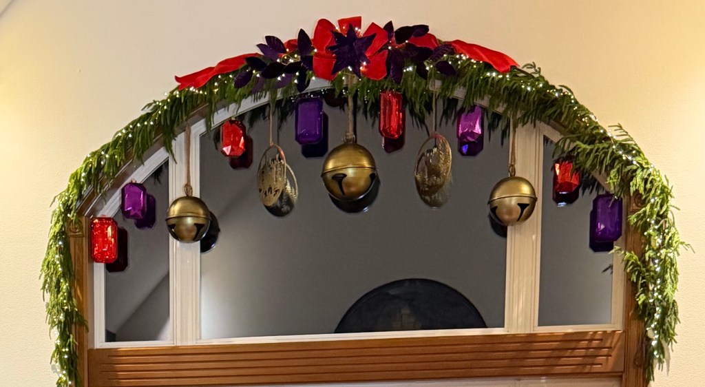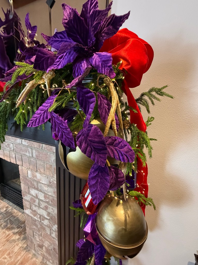Above the table, the arched window is draped with a 15′ Real Feel Norfolk garland. I used two strands of 20ft fairy lights to light the garland, and topped it with a large red velvet 4″ ribbon bow with a center purple velvet poinsettia and leaf sprays to each side. Below the garland, large sleigh bells dangle surrounded by gems and brass medallions.