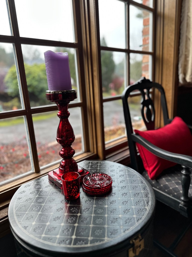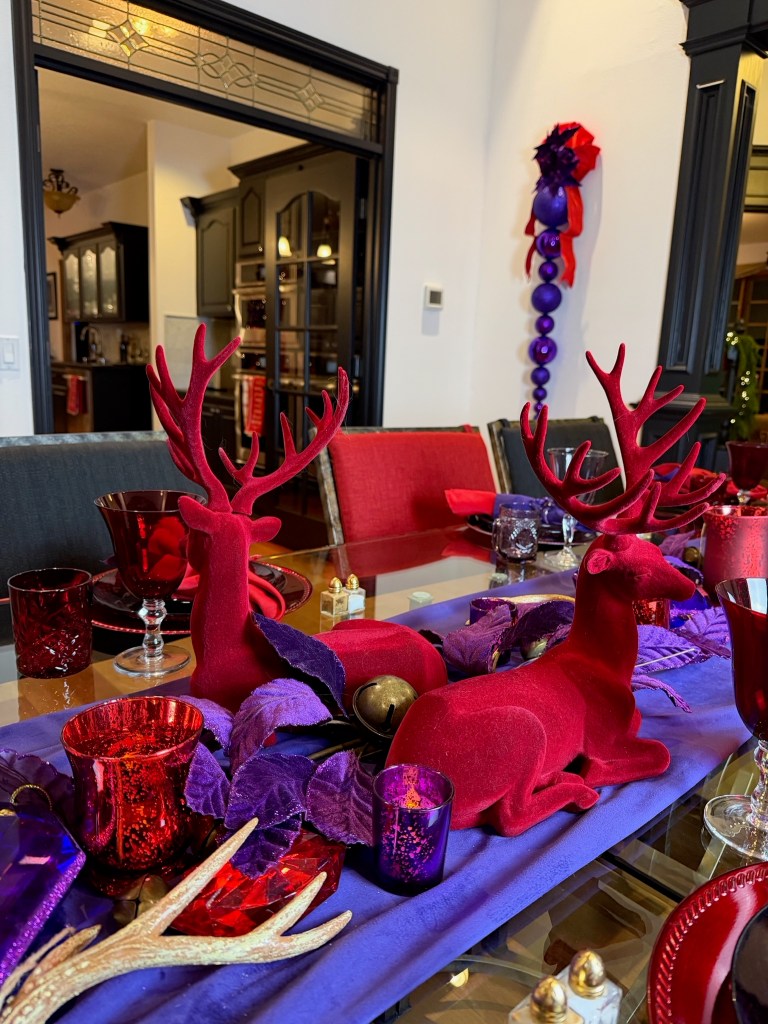 I started in the Dining Room by using alternating place settings of red or purple: Charger Plate, Crystal D’arque dinner and salad plates, and large water goblet & water glass. I layered purple and red napkins and used a beaded napkin ring. A long purple velvet runner flows down the table center and puddles onto the floor. Two large deer establish the center grouping. Sprays of purple velvet leaves intersperse with sleigh bells, large & small gems, various votives, cone trees, antlers, and smaller deer spilling down both sides of the table. Most of the ornaments were collected over a few years from Michaels and Hobby Lobby. The Raz jingle bells were found at various specialty shops on sale. Purple Velvet florals from FactoryDirectCraft.