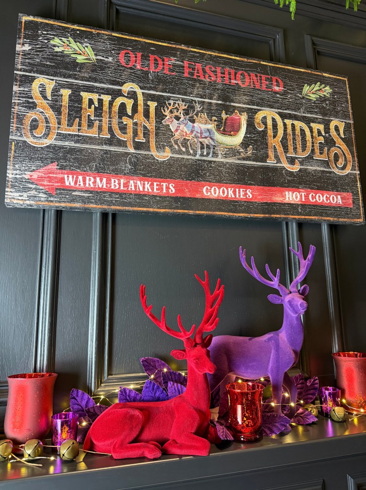 This year’s theme feels very traditional with a color scheme of Red & Purple and a focus on deer, jingle bells, and gems. The flocked deer and velvet florals and ribbons give a luxurious feel to the theme. It could be called “Get Your Jingle On”, but I kept it more elegant with “Sleigh Ride”.