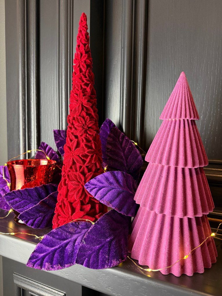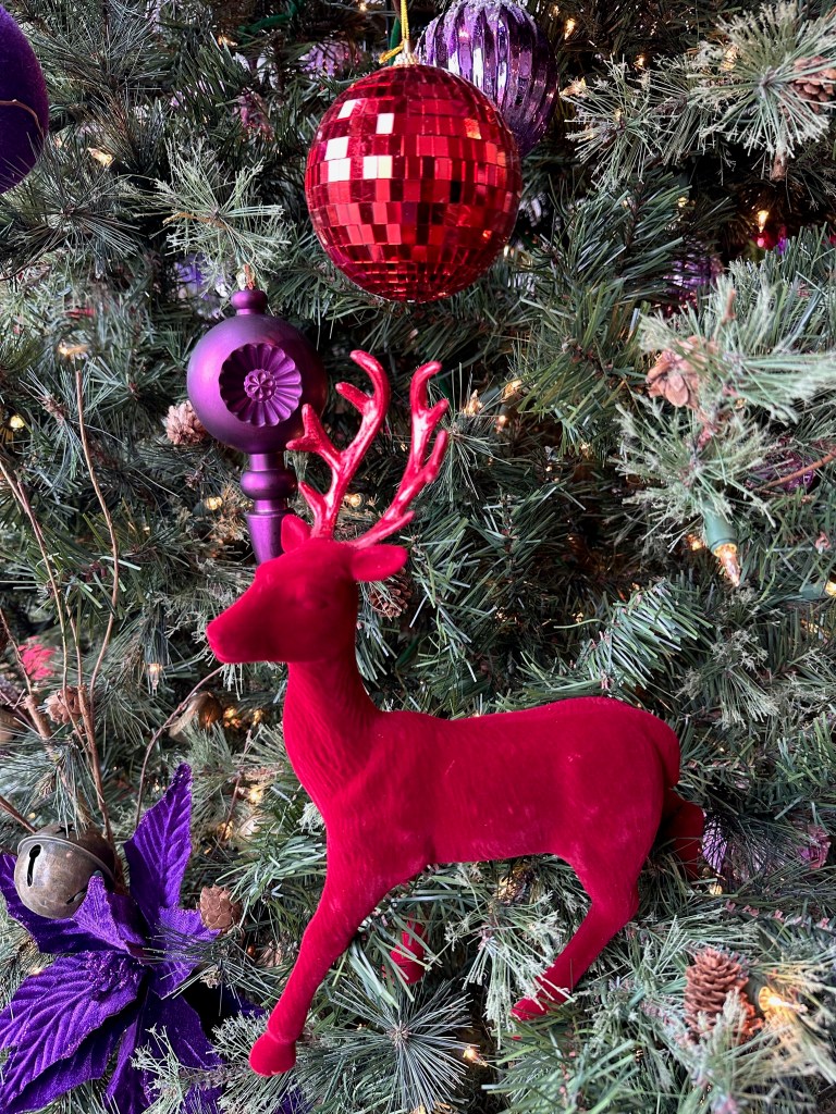 Other than the red deer of various sizes and the spinning red mirrored balls, I only use purple ornaments. I start by placing the spinner and largest ornaments, spreading them evenly around the tree and repeat this with each size and style of ornament. I make sure to place some ornaments deeper into the tree, and at the bottom are large purple balls to fill the larger spaces.