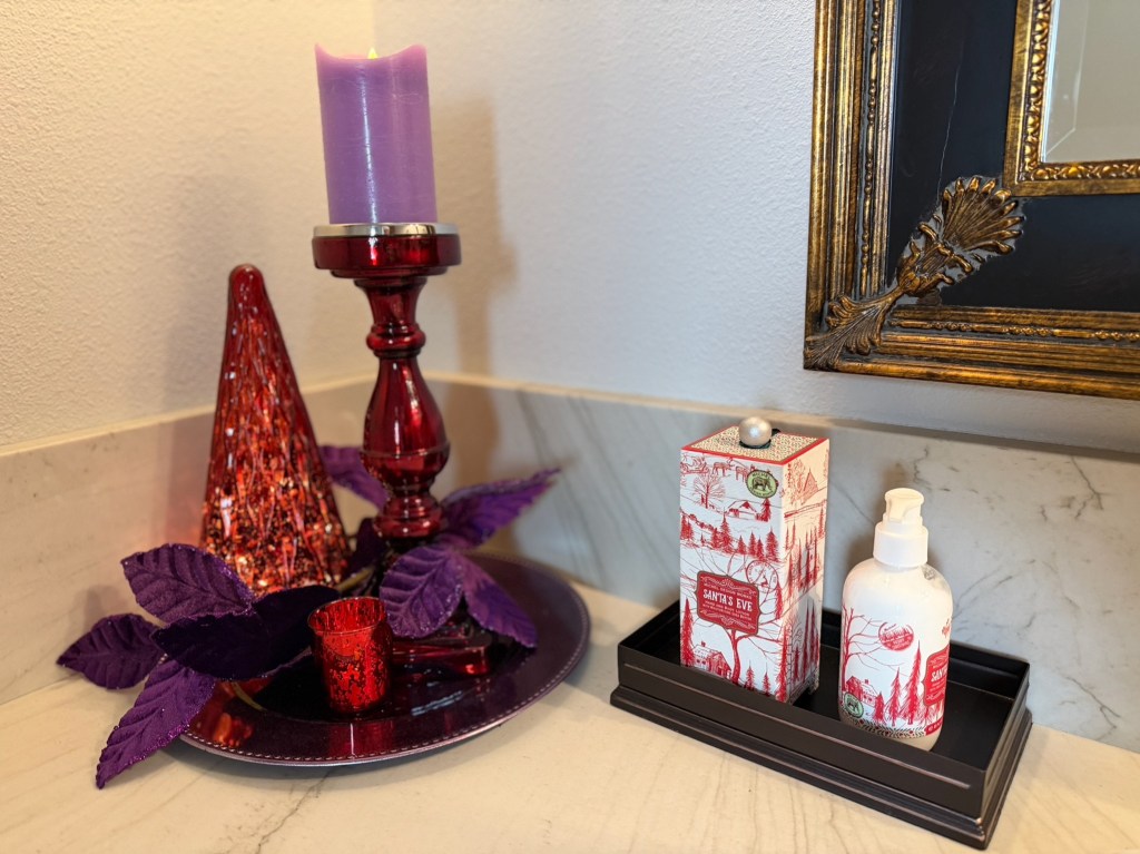 In the Guest Bath, a few touches of the theme appear along with Michel Design Works”Santa’s Eve” soap and lotion.
