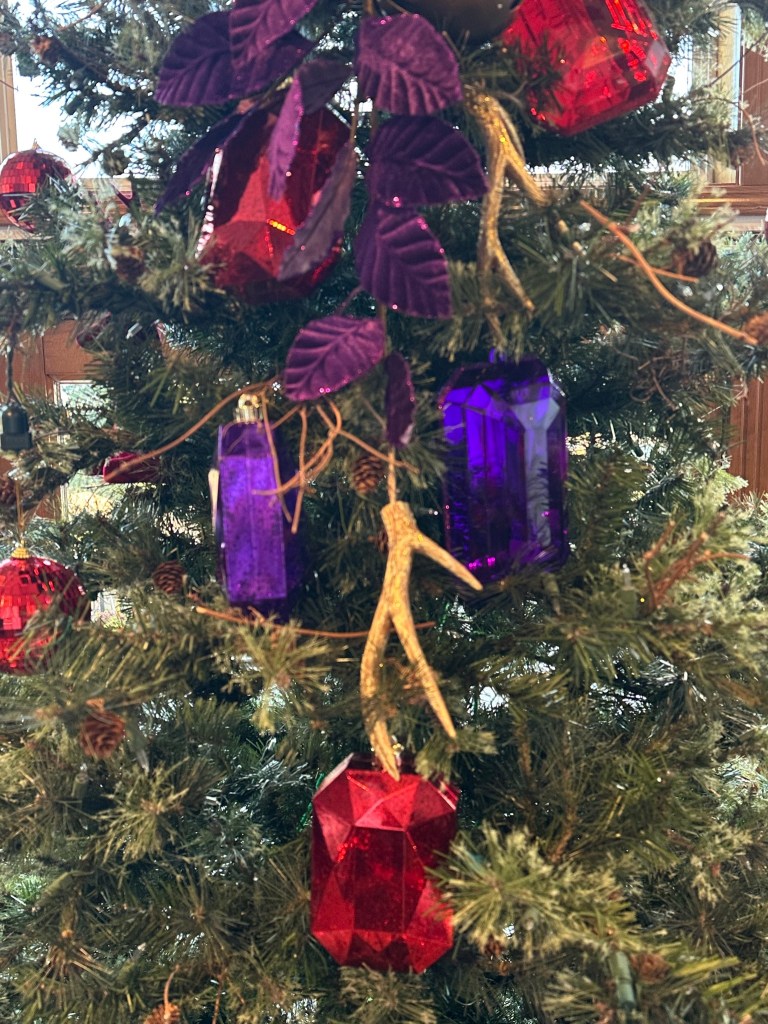 Other than the the topper and central focal point, I only used small purple gems around the tree. Presents are wrapped in alternating colors, ribbons, and gift tags.