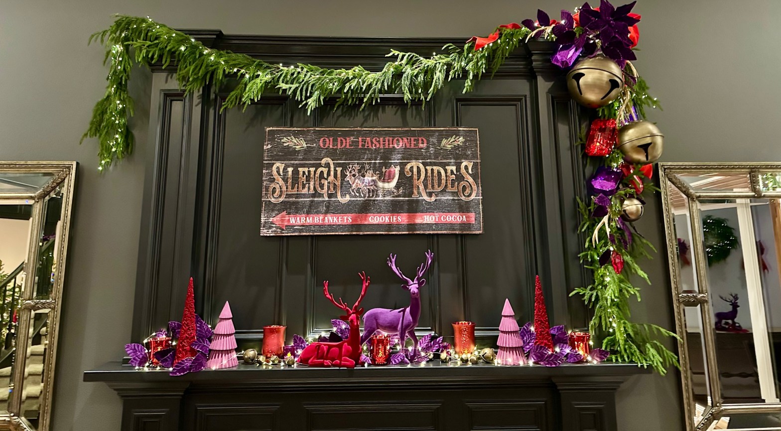 On the Fireplace, another Norfolk garland asymmetrically drapes the top mantel. At the corner, a large red bow tops the sleigh bells dangling down the edge with gems and velvet leaves. Two strands of fairy lights cover the entire garland and arrangement. On the lower Mantel, more flocked deer, sleigh bells, cone trees, velvet leaves, and votives. Sleigh Ride Artwork fills the center of the scene.