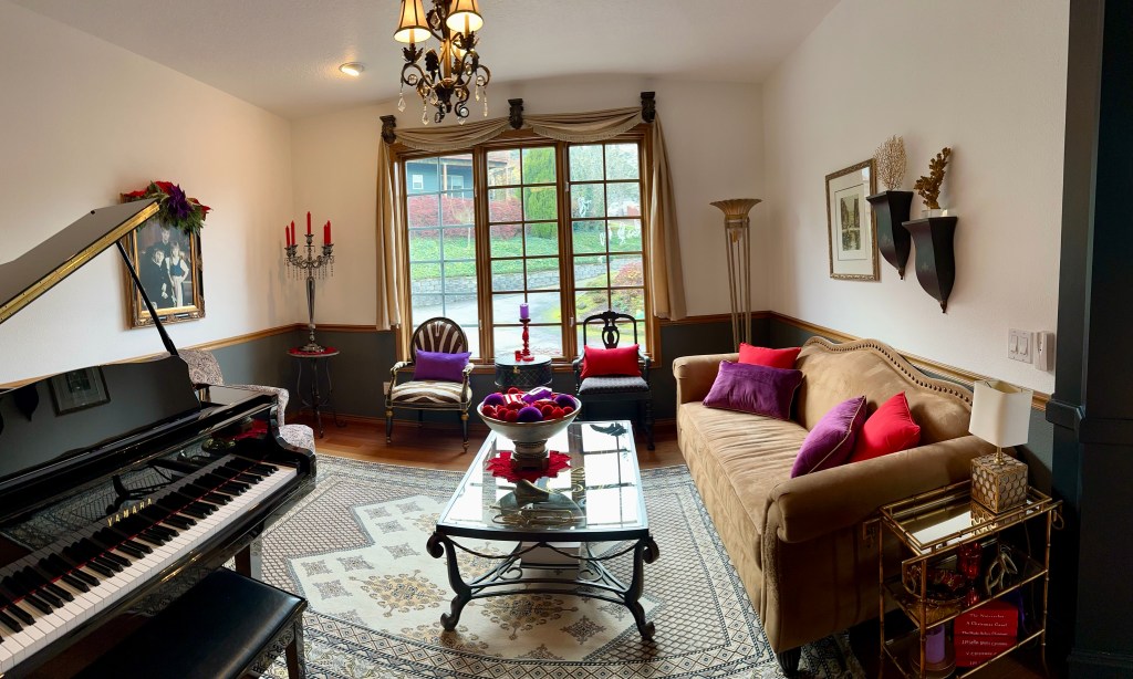 In the Living Room, I decided to save some time and energy by not setting up our traditional Dicken’s Village. Instead, I left the piano unadorned and splashed the room with the Sleigh Ride colors.